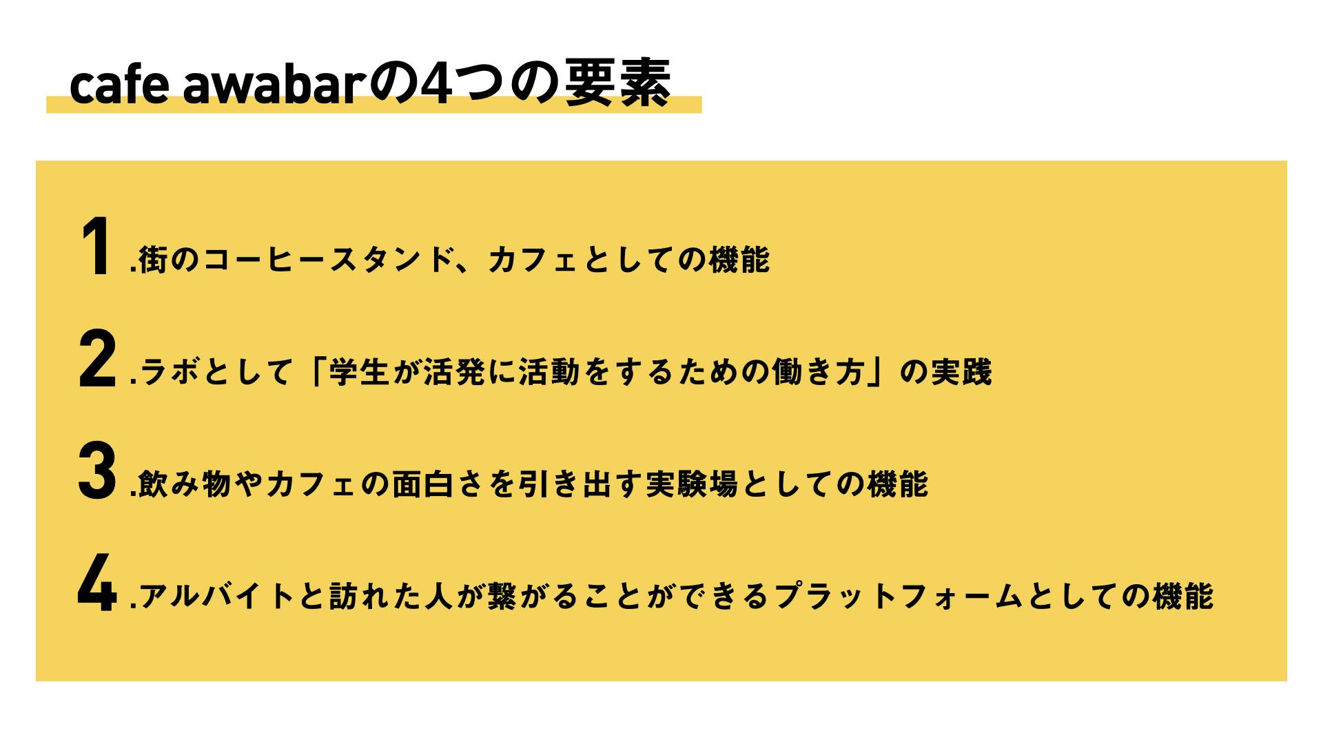 cafe awabarはエスプレッソマシンのないカフェスタンドです。“DRINK IS GOOD MEDIA”をコンセプトに、美味しさや喉を潤すことはもちろんのこと飲み物を通じて「まだ見ぬ自分とを引き合わせる」ことができるような体験を提供します。