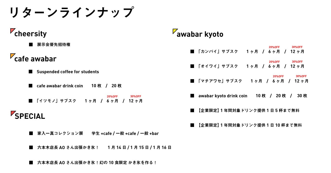 リターンはcheersityとしての取り組み、awabar kyoto 、cafe awabar の3つが存在し、京都に住まわれている方はもちろんのこと遠方の方でも喜んで頂けるようなものをメンバーで話を重ね決めました!緊急事態宣言等による非常事態によって営業日数が2/3以下になった場合も対応予定です。