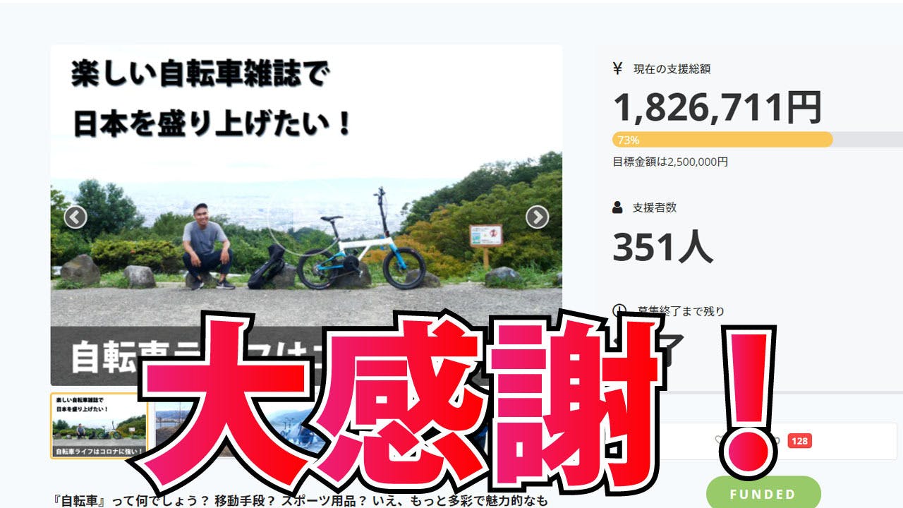 2021/01/17 15:04ご支援者の皆さま、はじめての皆さま、たいへんお世話になっております、プロジェクトリーダーのB4Cです。新しい自転車雑誌のクラウドファンディング、今日の23時59分で終了いたします。目標額まであと80万円! 最後までどうぞお見守りください。個人的には支援額より支援者数の方が不安でしたが、現時点で320人の方々にご支援をいただきました。ほんとうにありがとうございます!募集は23時59分までです。一人でも多くの方に参加いただけたらと思います。 もっと見る