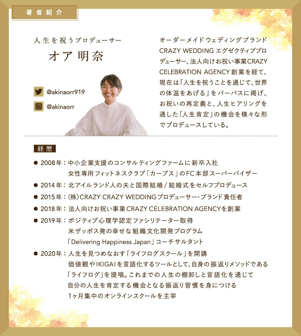 はじめまして。オア明奈です。私は2015年から6年間、オーダーメイドウェディングを提供するCRAZY WEDDINGのプロデューサーをしていました。その中で聞かせていただいたのが、200組近くの新郎新婦の心が震える「人生の話」です。