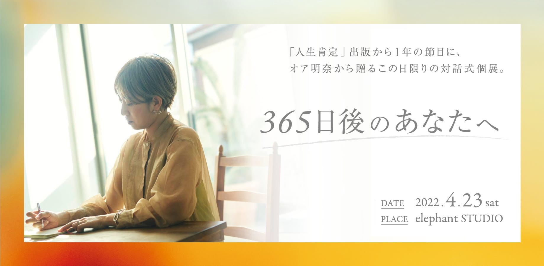 2022/03/18 21:03みなさん、ご無沙汰しております。オア明奈です。早いもので、「人生肯定」の出版からもうすぐ1年が経ちます。2021年12月末、おかげさまでクラウドファンディングで制作した1000冊ほぼすべてが私の元から旅立ち、「人生肯定本プロジェクト」を締め括りました。オンライン書籍化のリクエストも多数頂いたのですが、プロジェクト本来の目的と純度を保ってこの本は完結させたいという私の意思でそれはしないことに決めました。ただ1つの心残りは、本来ならば昨年4月に予定していた出版記念オフラインイベントが、長引くコロナの影響で開催が叶わず、この本を熱望してくれた人、クラファンを通じて支援してくださった人、この本を手に取ってくださった人たちと、直接お会いする場が持てずにいたことでした。それでも1年経った今だからこそ行う意味があって、今しか伝えられないメッセージがあるのではないか。そんなことを思い立ち、2022年4月23日(土)出版から丸1年の節目であるこの日に、1日だけの個展を開催することにしました。一般向けのイベントではなく、人生肯定本を手に取ってくださった方々に向けた、この1年を振り返る場としてお届けしたいと思います。人生の変化を味わう時間を、今回は「本」ではなく「空間」に込めました。私も終日在廊し、皆さんとお話しできるのを楽しみにしております。「対話式個展」という新たな試み。コンセプトを大切にこの日限りの開催となります。人生肯定本片手に、あなたの365日を重ねながら楽しんでいただけたら幸いです。ぜひご来場をお待ちしています。詳細はイベントページをご覧ください。「人生肯定」出版から1年の節目に、オア明奈から贈るこの日限りの対話式個展ー365日後のあなたへー■個展コンセプト「365日後のあなたへ」あれから365日。人生肯定のその先に、どんな景色があったのだろう。不安だったあの日も、少し前に進んだあの日も、喜びで溢れたあの日も。毎日の積み重ねが人生になっていく。忙しい日々の中で、今日だけは少し足を止めて、1日、1日を紐解いて人生を味わってみてほしい。この本を読んでくれたあなたへこの本を愛してくれたあなたへ365日後のわたしから贈る、もう一つの人生肯定。■Information -Date :2022年4/23(土)「人生肯定本出版から365日後」というコンセプトを大切にしたく、1日のみの開催とさせていただきます。※最適人数にてご鑑賞頂きたいため、時間別に定員を設けてのご案内となります。-Place :elephant STUDIO〒150-0002 東京都渋谷区渋谷2-7-4JR渋谷駅 ハチ公口より徒歩10分 / 東京メトロ「表参道駅」B1出口より徒歩10分 駐車場のご用意はございません。お車でお越しの場合は近隣の駐車場をご利用ください。-Ticket:2,500円(6歳未満無料)*1drink & 365日後のあなたへのギフト付き今回は個人的な企画となりますが、会場利用・制作費としての金額とさせていただきます。ご協力ください。希望時間のチケットをお選びいただき、ご購入ください。◉2Fのメインギャラリーは一人で静かにお楽しみください。1Fには、観覧後に自由に過ごしていただけるフリースペースをご用意しています。著者オア明奈との記念撮影や、読者同士の交流など、お飲み物を片手にゆっくりお過ごしください。(※1Fも会場の人数制限により、滞在時間を制限させていただくことがございます。ご了承ください)-----------------------------※残念ながら当日ご来場が叶わない方へもしよろしければ個展制作の参考に、こちらのアンケートにて本の感想やご自身の変化を聞かせていただけると嬉しいです。【人生肯定 出版1年の節目への想いはこちらのnoteに】「人生肯定」をnoteにて全文公開することを決めました。クラファン開始から丸1年経った2022年2月14日「目次・はじめに」の公開を皮切りに、3月から2022年12月まで、毎月14日に1章ずつ全文公開していきます。12月には、この全文公開に合わせて新章を書き下ろす予定です。周りに「人生肯定」という考え方を届けたいという人がいらっしゃいましたら、ぜひ、全文公開noteマガジンをご案内ください。(「 #旅する人生肯定本」としてお手元の本を、大切な方に貸したり、譲ったりして頂けるとなお嬉しいです!) もっと見る【人生肯定本お届けから1ヶ月が経ちました】感想をぜひお聞かせください!