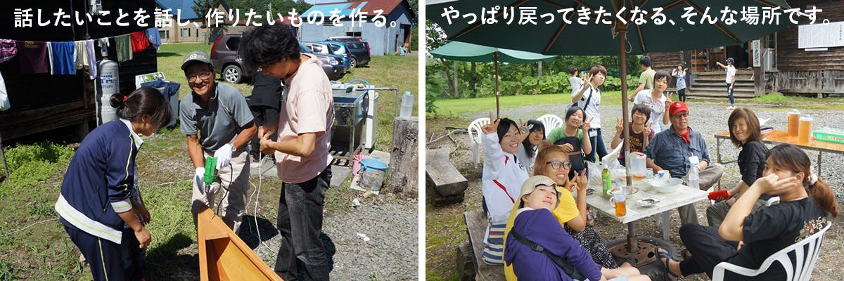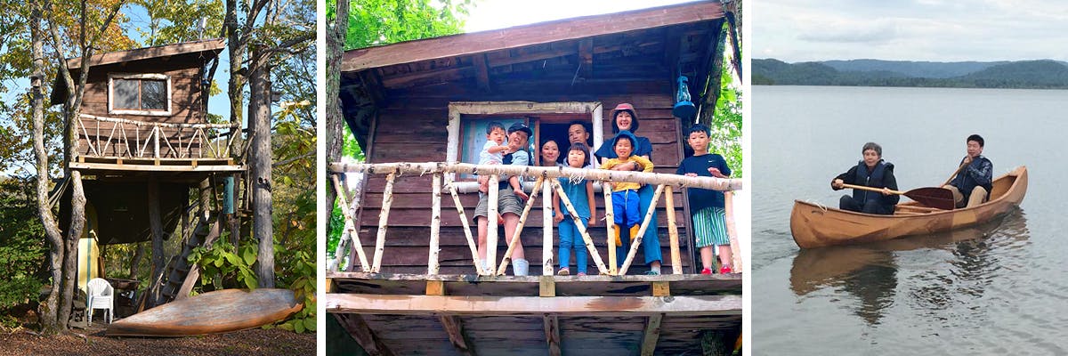 また、五右衛門風呂「シュマリの湯」や、ツリーハウス「くまげら荘」、カヌーなど、ワークショップの参加者たちが作った自然を満喫できるアイテムが揃っています。