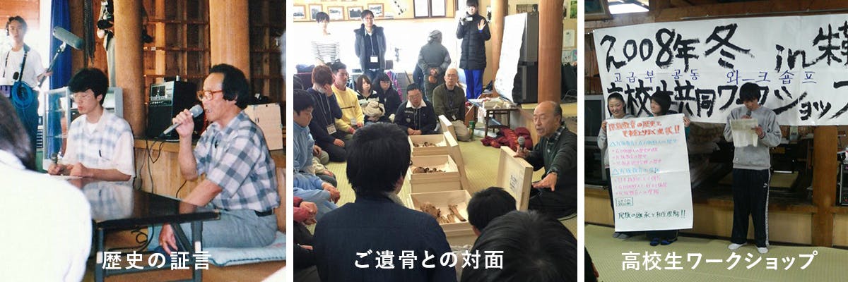 代表の殿平善彦と韓国の鄭炳浩(チョン・ビョンホ、韓国漢陽大学文化人類学科名誉教授)の偶然の出会いをきっかけに、日本・韓国・在日韓国/朝鮮人の大学生などが合宿をしながら遺骨発掘をする「日韓共同ワークショップ」が始まりました。