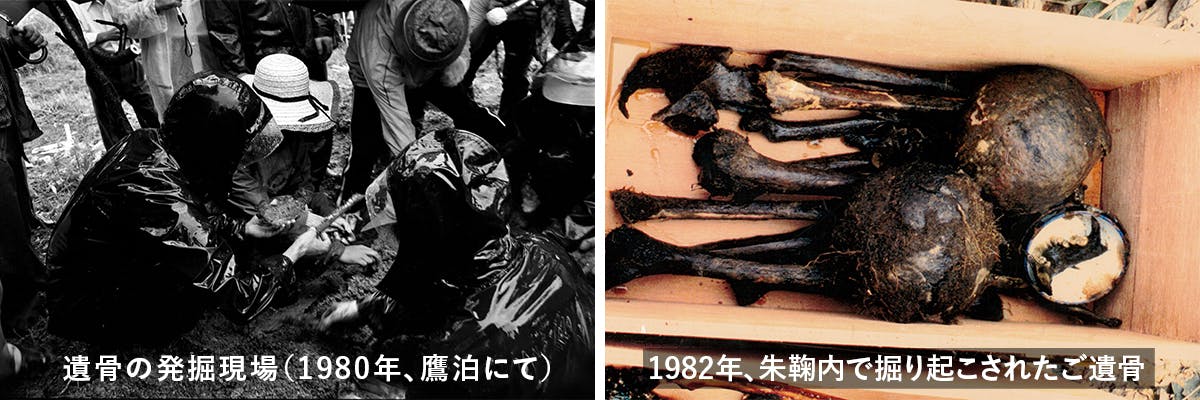 1980年5月、朱鞠内共同墓地裏で犠牲者の遺骨発掘がはじめて行なわれ、雪どけのあとの笹薮を刈り取った土の中から、6体の遺骨が掘りおこされました。