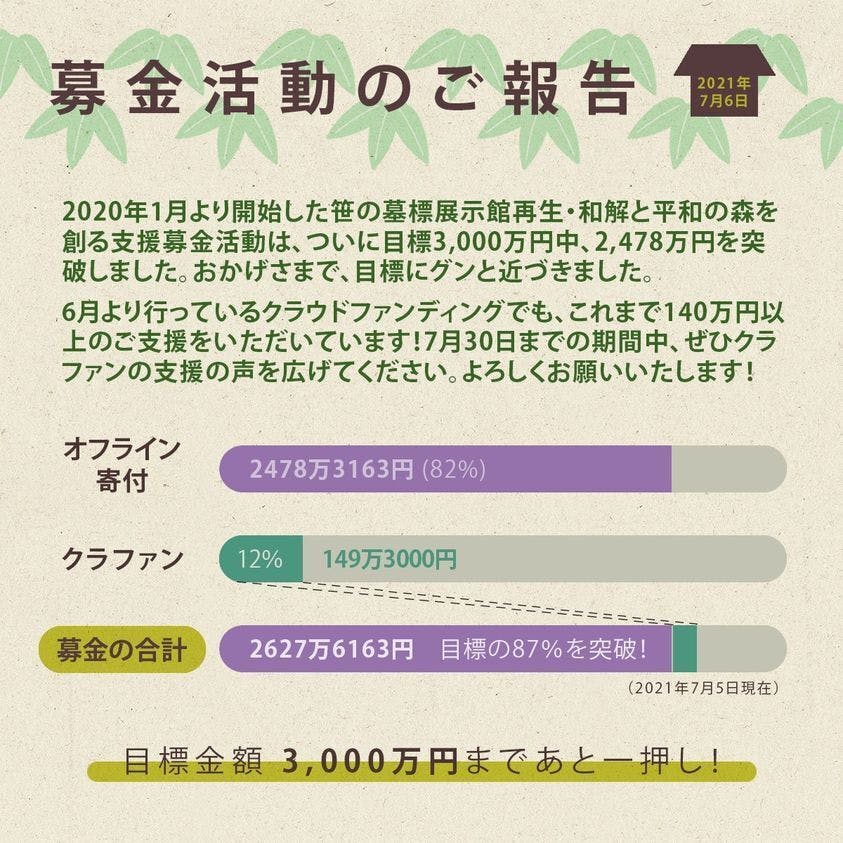 2021/08/04 19:026月1日からスタートしたクラウドファンディングは、7月30日をもって終了いたしました。クラウドファンディングにお寄せいただいたご支援は、3,882,000円、381名にのぼりました。クラウドファンディングを開始して以降、WEBが苦手だからとオフラインでも500万円を超える寄付が寄せられました。知人にお声がけくださった方、SNSなどを通じてご協力くださった方、たくさんの皆さまの心のこもったご支援や応援のメッセージをいただくことができ、感謝の気持ちでいっぱいです。皆さまからのお気持ちを受け止めながら、展示館の再建への意義を改めて強く感じております。皆さまからのご協力により、笹の墓標展示館再建のための募金は、2800万円を越え、目標まであと一歩と迫りました。引き続き目標達成に向けて募金活動を続けながら、歴史と向き合い、東アジアの和解と平和を築くための新たな展示館再生に向けて、歩みを進めて参ります。今後の活動などは下記のサイトをご参照いただき、引き続きのご関心をお願い申し上げます。https://www.sasanobohyo.com/この度は、本当にありがとうございました。笹の墓標展示館 再生 クラウドファンディング事務局一同 もっと見る【感謝と最終よびかけ】笹の墓標再生実行委員会 事務局 金英鉉(きんよんひょん)