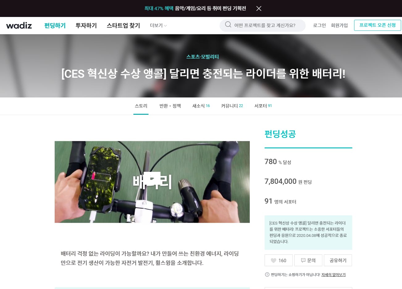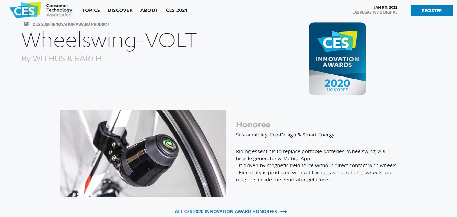 ウィズアースは2017年に設立された韓国のベンチャー企業で、より多くの人がいつでもどこでも環境にやさしいエネルギーを簡単に利用できる事を目指し、世界初の非接触発電技術を応用した自転車専用の発電機を開発しました。