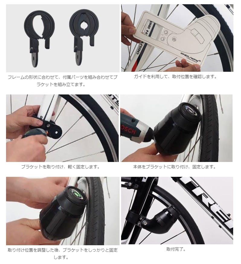 様々なデザインの自転車に対応したユニバーサルブラケットと豊富な付属品により、簡単に取付が可能です。また工具も付属しており、購入後すぐに取付できます。