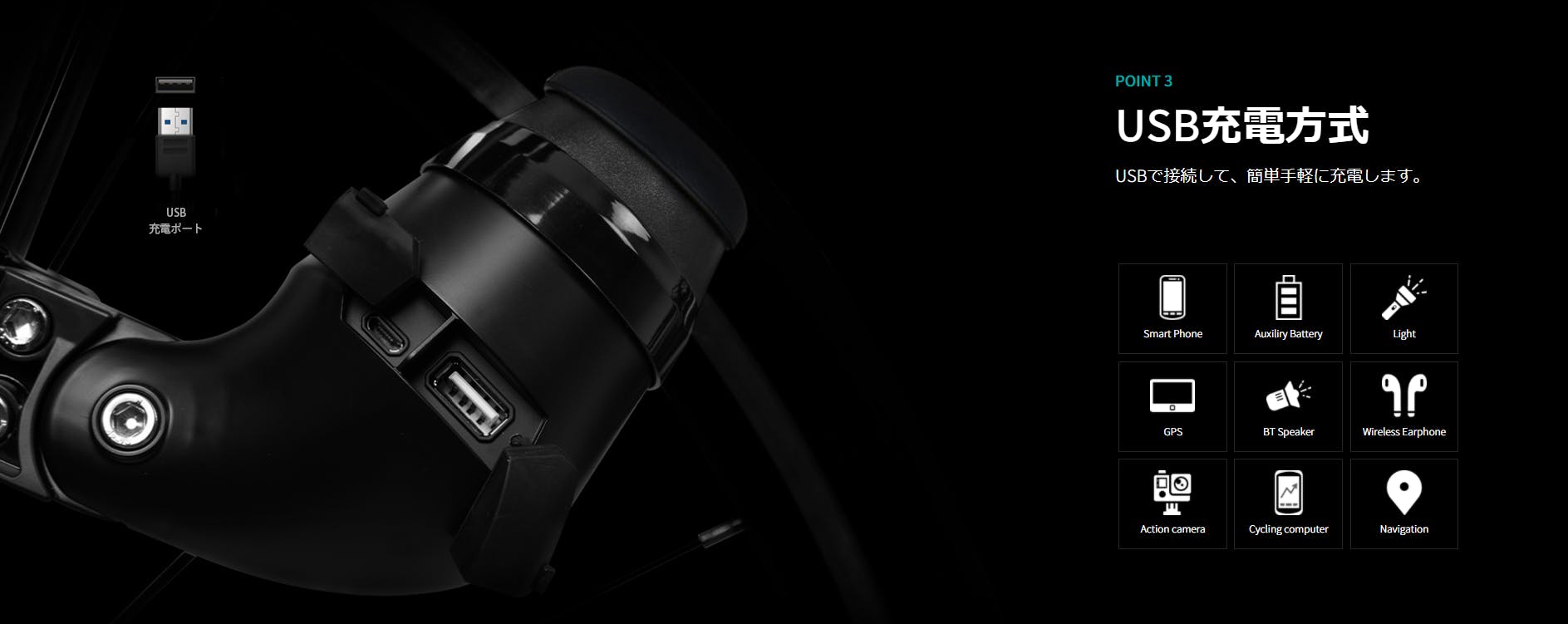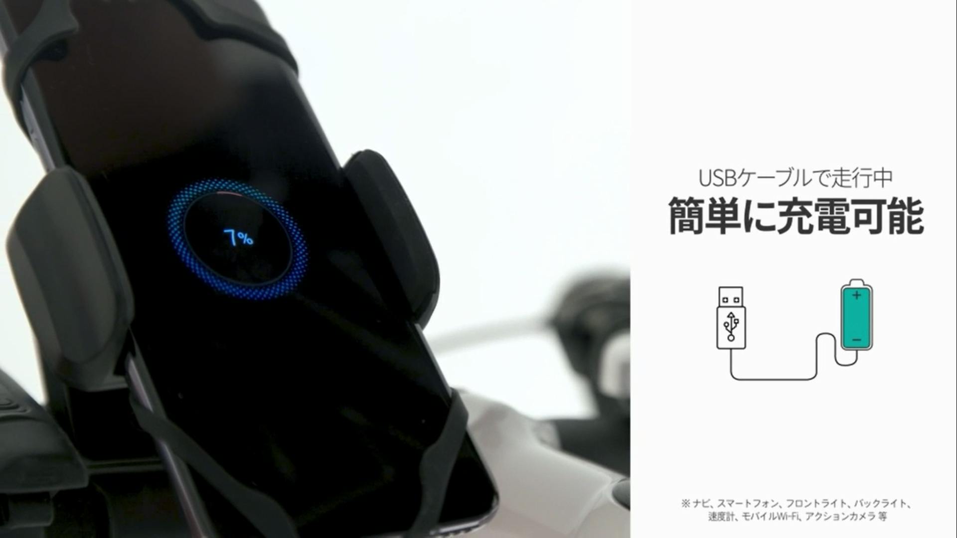 発電された電気はUSBポートからスマートフォン、自転車用品など様々なアクセサリーを充電することができます。スマートフォンや自転車用品等の充電切れの心配をせずにツーリングが楽しめます。