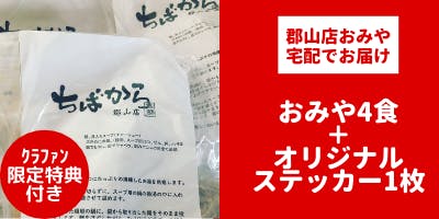 ちばから郡山店のオミヤ(宅配)4食分とクラウドファンディング限定ステッカーをお送りします。