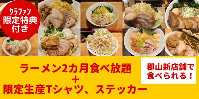 ちばから郡山店新店舗で使用できるラーメン2か月食べ放題チケットとクラウドファンディング限定Tシャツとステッカーをお送りします。