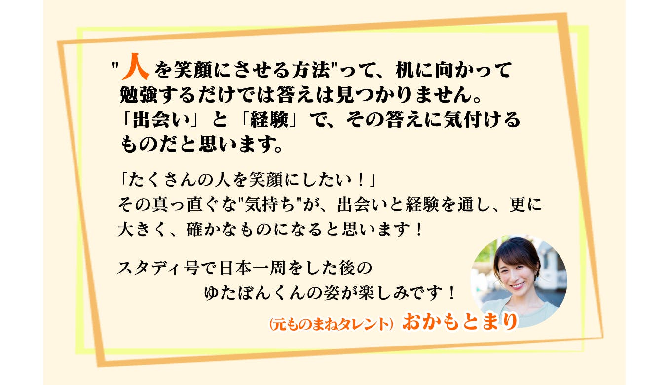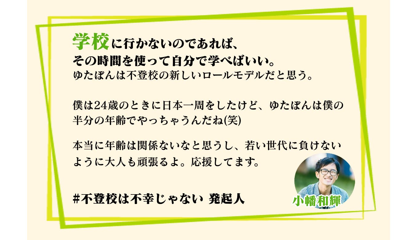 僕はYouTubeやラジオとかの言葉だけじゃなく、自分自身の挑戦でたくさんの人に元気と勇気を与えたいと思っています。今回のゆたぼんスタディ号で日本一周するのも僕にとっての大きな挑戦であり、それを見てくれる人や応援してくれる人にパワーを届けたいと思っています。