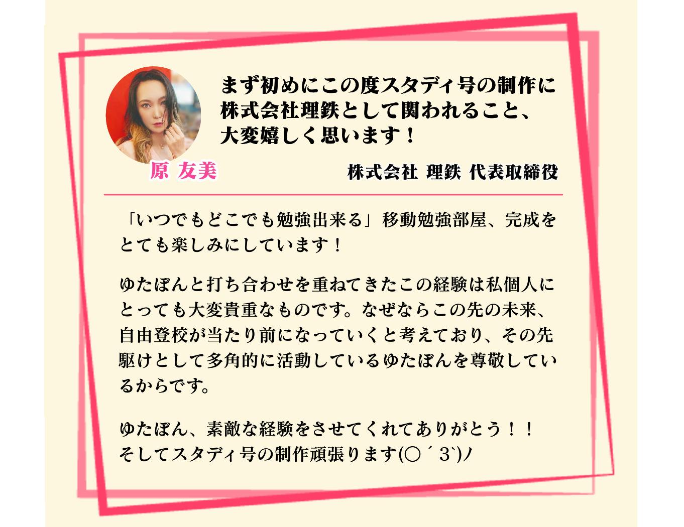 最初に提案してくれたのが株式会社理鉄の原友美さんで、「ゆたぼん専用の勉強カーを作ろう」と行ってくれて、それはいいなと思いました!