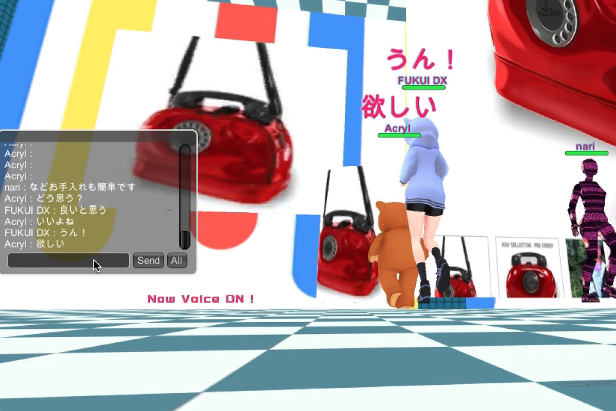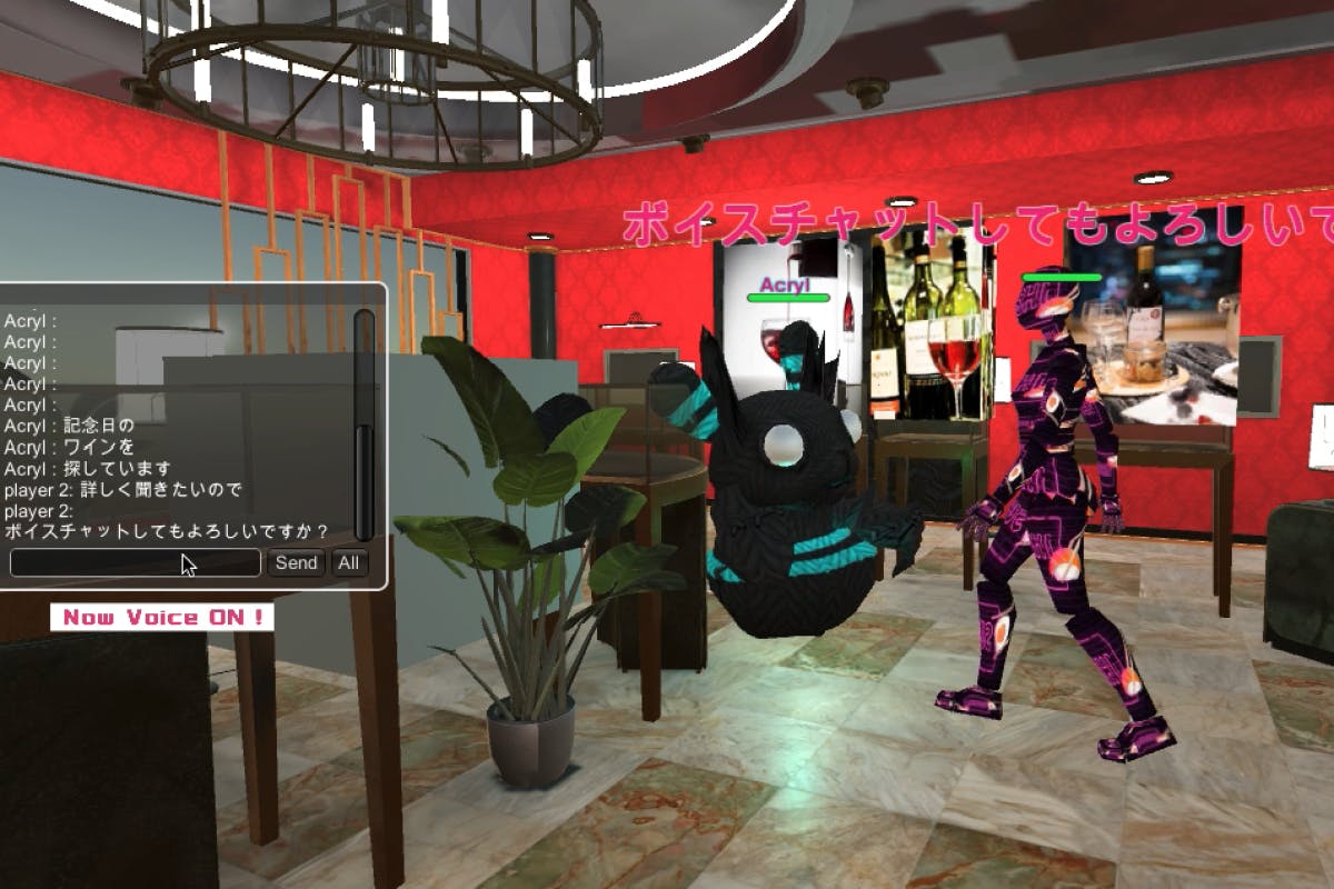 友達と同時ログインして音声通話やチャットをすることも可能。空間の中にはいくつかの店舗があり、友達と会話しながら様々なお店に立ち寄ったりと、まるで街に出て買い物しているかのような体験が出来ます。