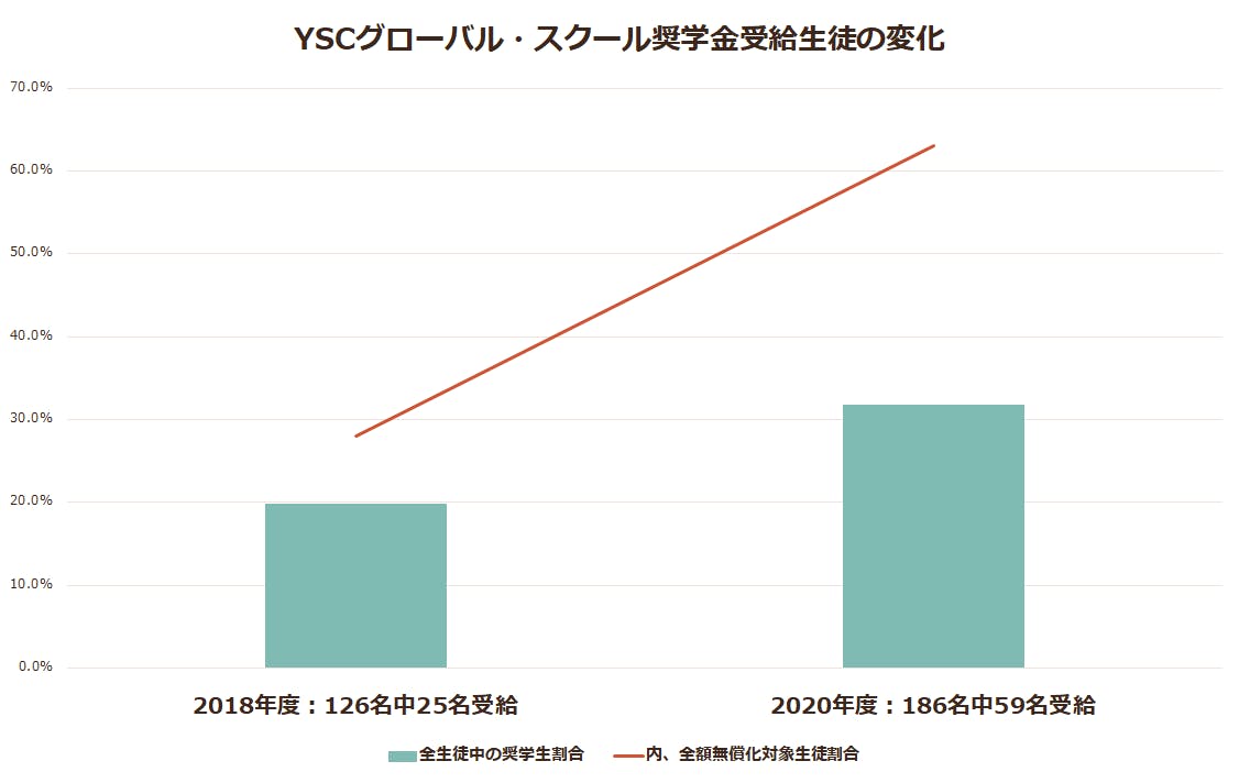 2020年4月~2021年3月に全額無償を必要とした生徒は31人に上りました。10か月間の延べ人数にすると235名です。これは奨学金の受給生徒延数の63%に上り、2018年度と比べ2.25倍となっています。