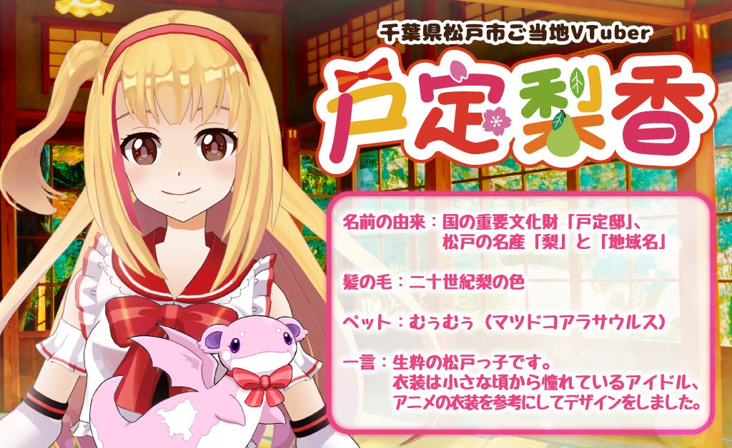 大好きな松戸市を沢山の方に知っていただくこと、そして私の活動を通じて、皆様に笑顔になってもらうこと、元気になってもらうことが私の夢であり、2020年4月にVTuberとしてデビューしました。