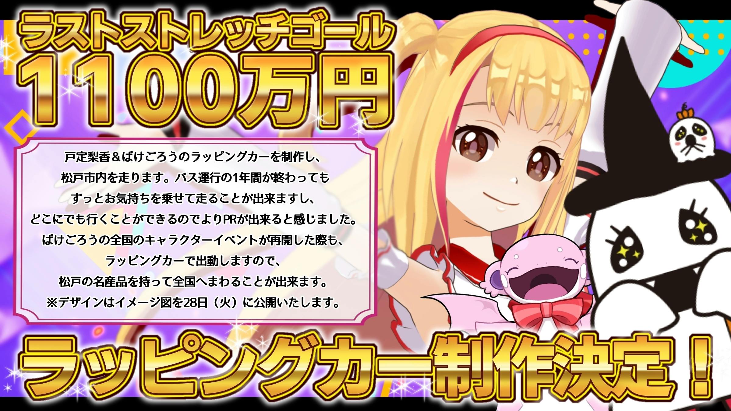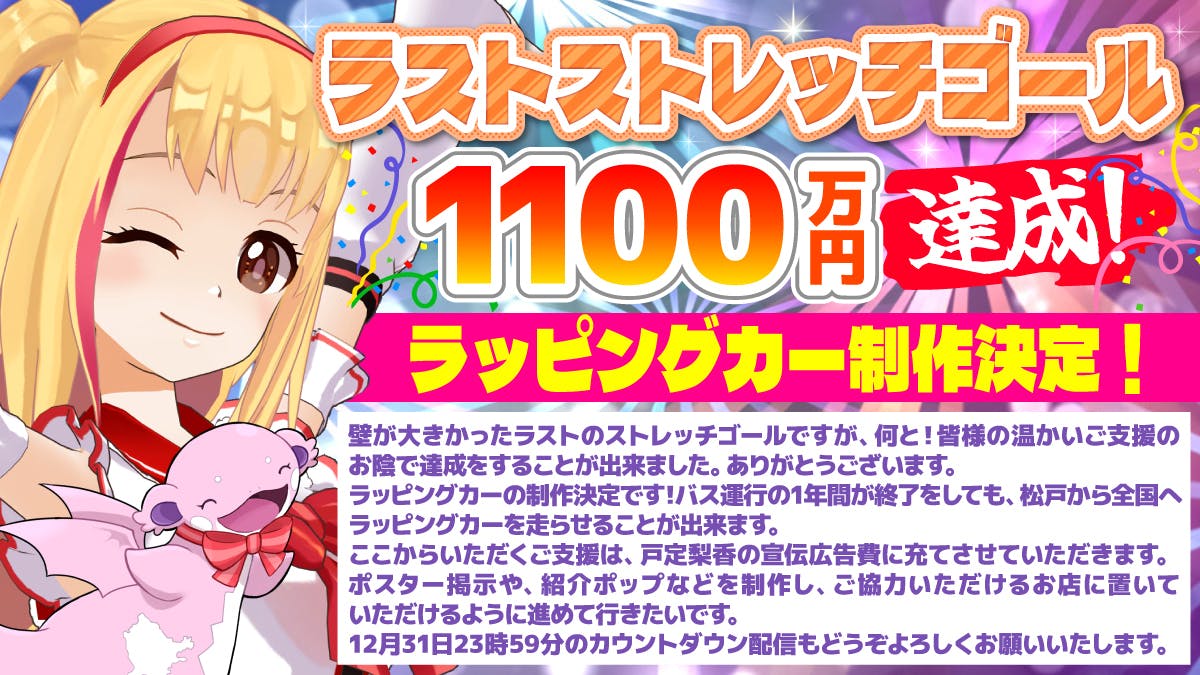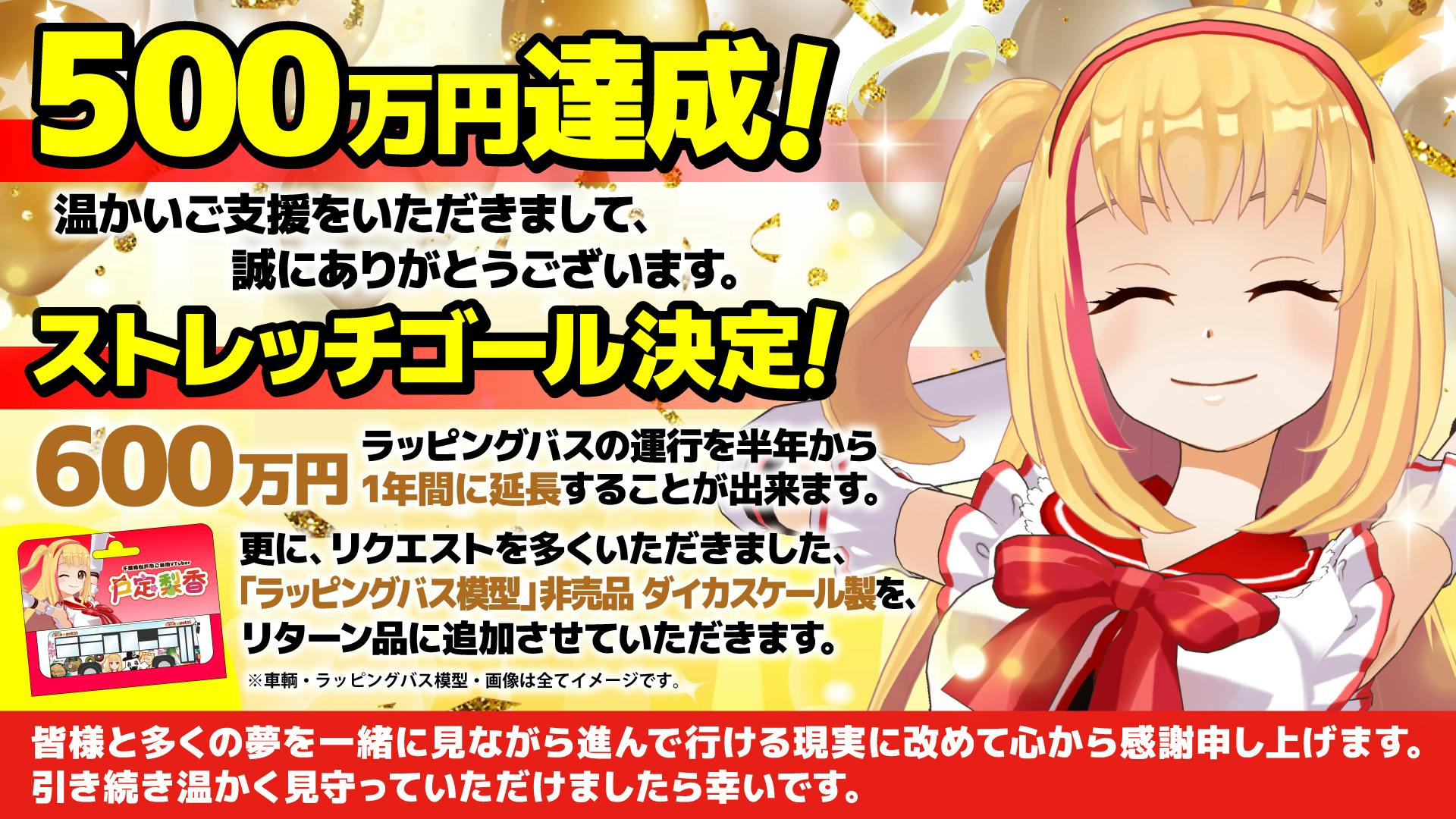達成おめでとうございます!是非ラッピングカーも走って欲しいです。他県からではありますが、戸定さんをいつまでも応援しています!!!