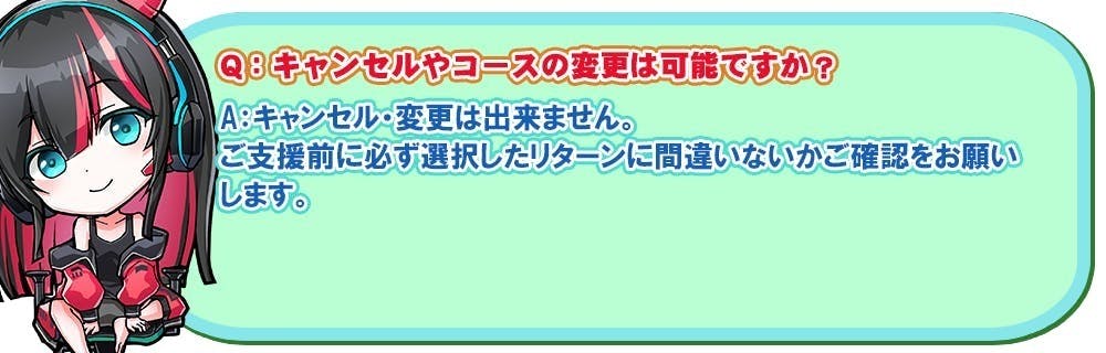 For English version please open here. Due to system restrictions only Japanese texts are shown on the support page. Please check against here before making the support. In particular, all plans involving physical products are not deliverable outside Japan as we do not offer international shipping.