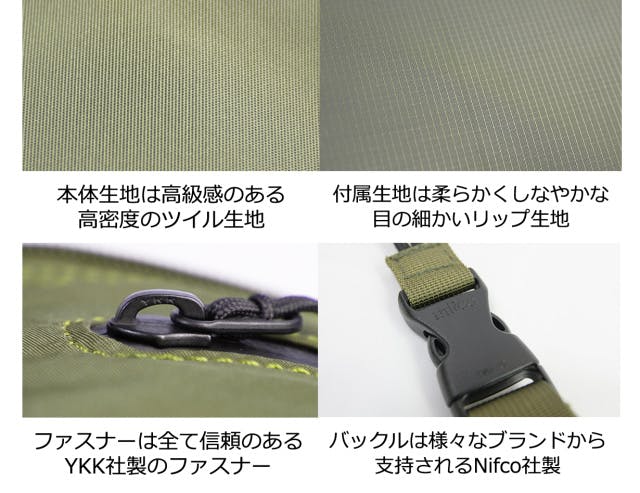素材:本体生地 Nylon / リップ生地:Polyester / 裏地:Polyester