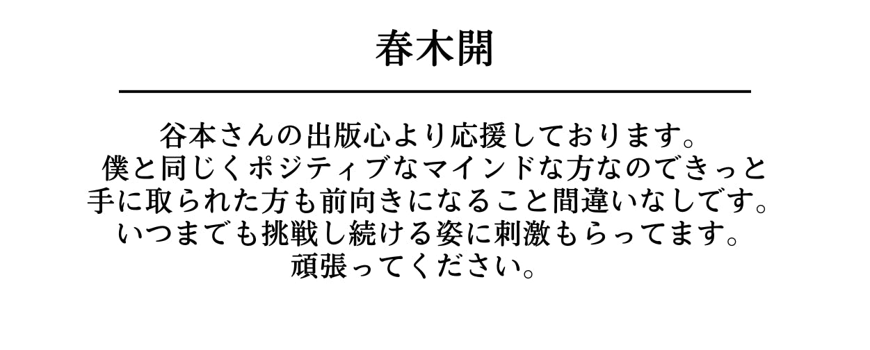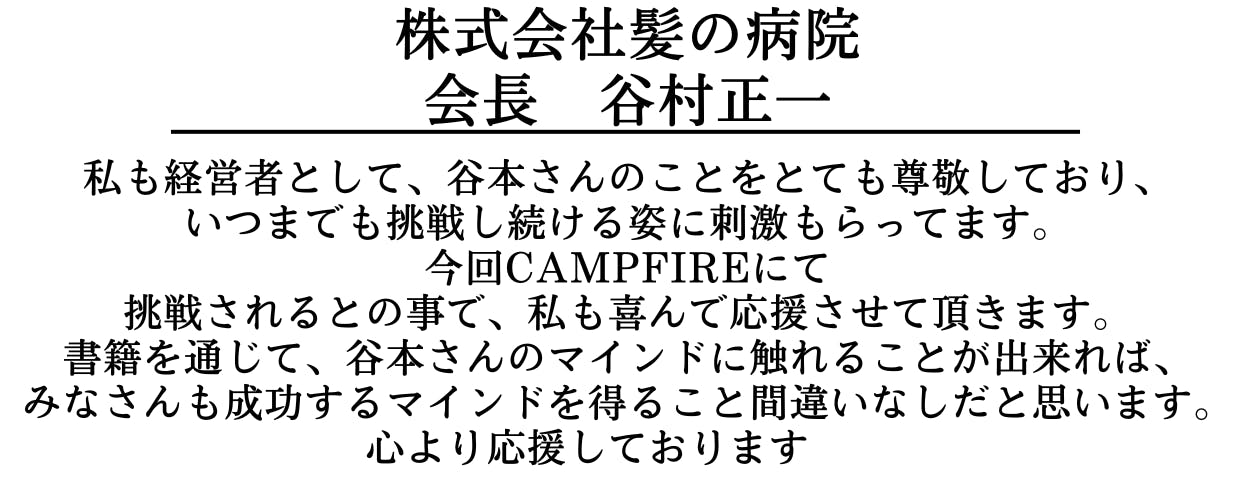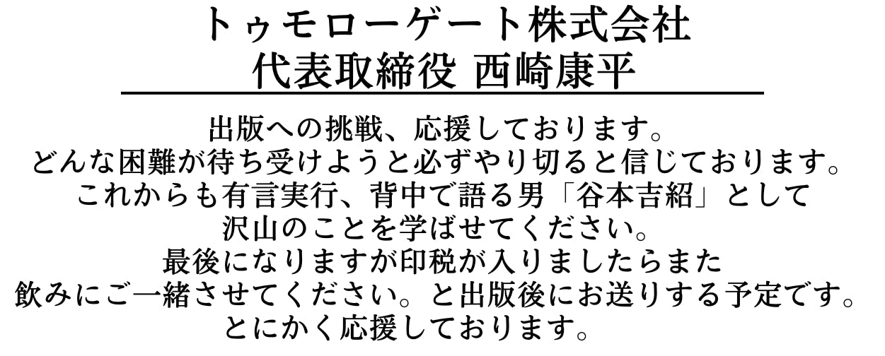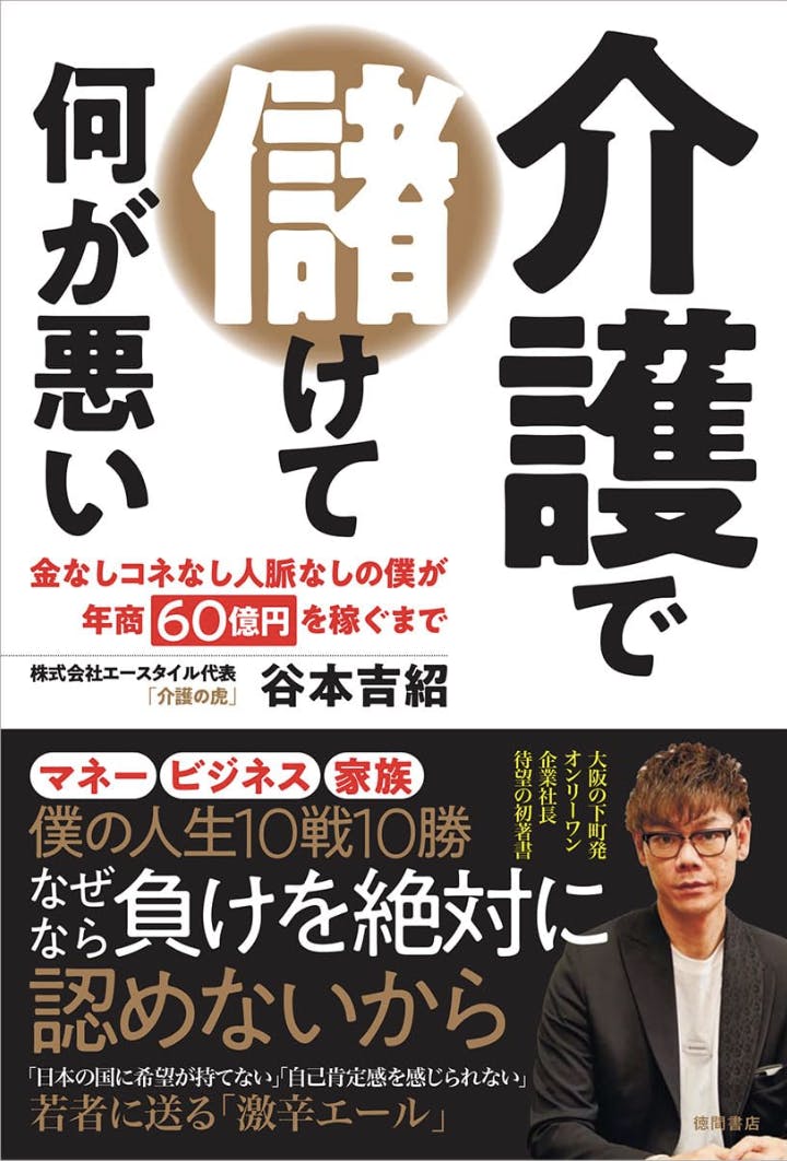 2023/08/01 18:13谷本吉紹書籍プロジェクトを応援頂いた皆様大変お世話になっております。谷本吉紹です。ご連絡が遅くなり、大変恐縮でございますが、明日より書籍発売開始となります。日々劇的なスピードで物事が進んでいるのですが、書籍についても自分でも驚くスピードで出版まで進みました。出版社は徳間書店様で、書籍タイトルは「介護で儲けて何が悪い」です。タイトルは、介護にまつわるテーマになっておりますが、介護に関してのみ語っている訳ではなく、ビジネス・お金・家族・人生と幅広いテーマの著書となっております。自分でいうのは恐縮ですが、読み応えある著書が完成致しましたので、楽しみにして頂けると嬉しいです。書籍やリターンの発送に関しましては、出版社から弊社に届き、準備が整い次第発送致しますので、お待ち下さいますと幸いでございます。また書籍の感想なども聞かせて頂けますと幸いです。よろしくお願い致します。谷本 吉紹 もっと見る「令和の虎」で私が出資した陣内巧さん人生最大のピンチを応援したい