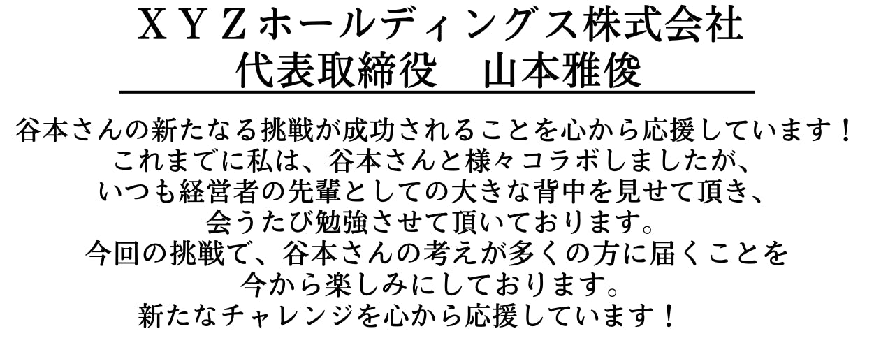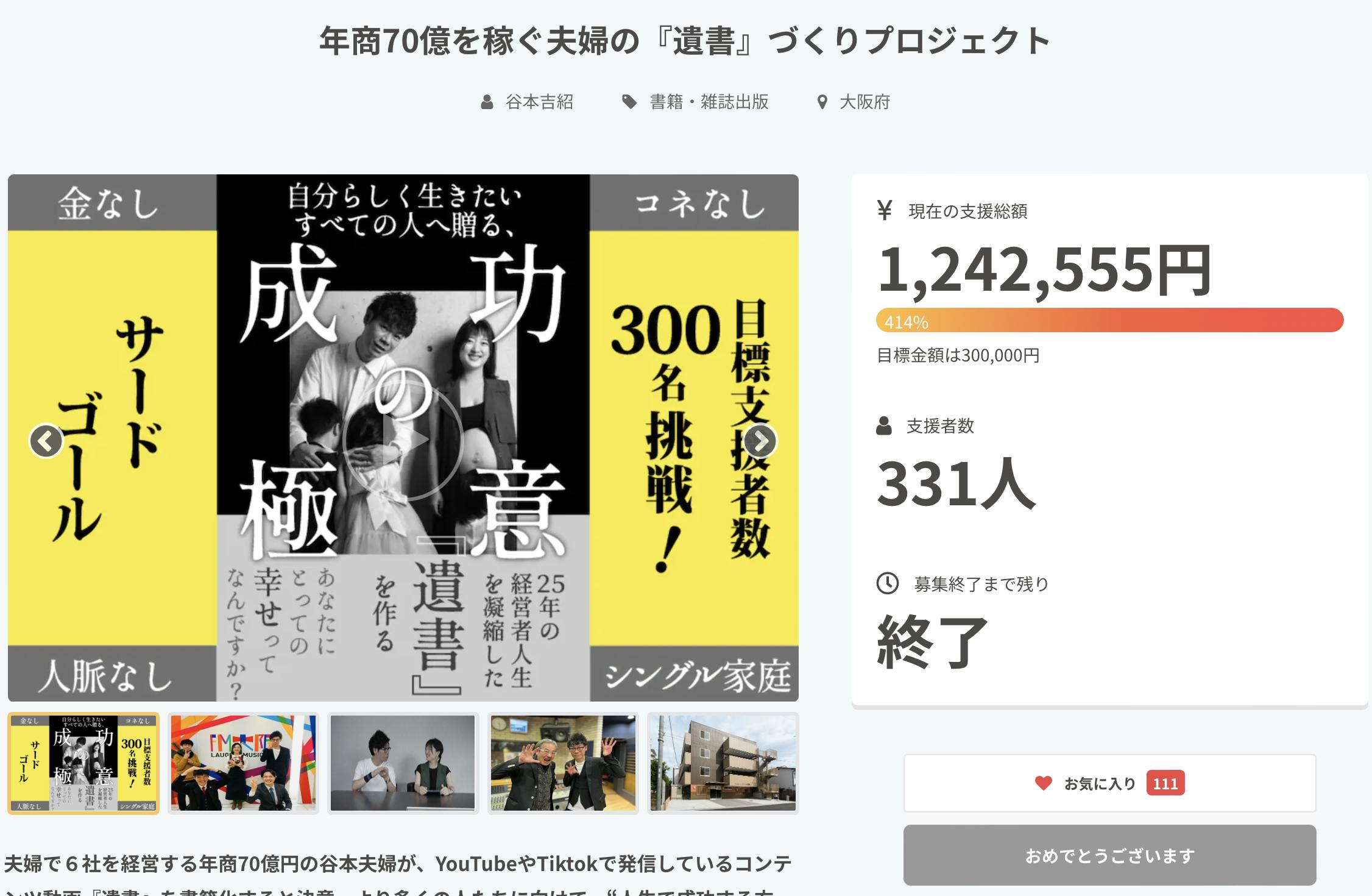 2022/12/02 13:26この度は『遺書』づくりプロジェクトにご支援頂きありがとうございました。皆様のおかげで、こちらのプロジェクトは、支援総額1,242,555円 支援者人数331人で終了となりました。支援総額につきましては、目標金額300,000円に対して414%を達成し、支援者数につきましても、設定しましたサードゴールを無事達成することができました。今回の『遺書』づくりプロジェクトを通じてご支援頂きました皆様の想いを胸に、初めての著書が25年間の経営者人生を凝縮した一冊になるよう、準備を進めて参ります。都度キャンプファイヤー内やSNSにて情報を発信して参りますので、引き続きよろしくお願い申し上げます。初めてのクラウドファンディングにおいて、無事に目標を達成できましたのは、ご支援頂いた皆様のおかげです。本当にありがとうございました。クラウドファンディングの支援期間は11/30で終了ですが、ここからがこのプロジェクトの本当のスタートだと思いますので、引き続き皆様よろしくお願い申し上げます。株式会社エースタイル代表取締役 谷本 吉紹 もっと見る
