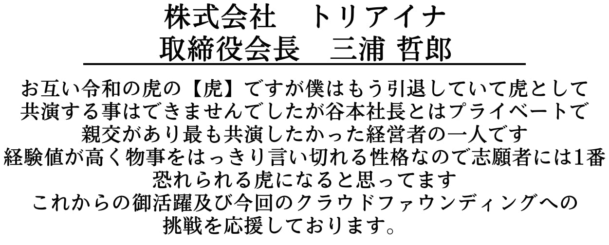 2023/02/24 19:16いつもお世話になっております。エースタイル代表取締役 谷本吉紹です。皆様にご支援頂きました「書籍化プロジェクト」に関しましては、少しずつではありますが前進中でございます。もう少し執筆が進んだタイミングで制作過程のお話をこちらでお知らせ致しますので、引き続きよろしくお願い申し上げます。さて、今回の投稿では皆様にお伝えしたいことがあり、この場を借りてお話致します。令和の虎chで私が出資した志願者に陣内巧(じんのうち たくみ)さんという方がいます。この度、陣内さんが、人生最大のピンチを乗り越えるために、この度CAMPFIREに挑戦することになりました。https://camp-fire.jp/projects/view/653560?utm_campaign=cp_po_share_mypage_projects_show詳しくはリンク先のプロジェクト内容を見て頂きたいのですが、陣内さんは、カレーサンド屋「だらだらするだら?」というお店をオープンするために令和の虎に出演されました。収録の際、お店の看板メニュー「サバカレーサンド」を試食したのですが、サバ嫌いの私が感動したほど絶品のサンドウィッチでした。ただ、陣内さんは、実は料理も運転もデザインもできない方で、お店のカレーサンドは、料理長がいないと作れないとのこと。収録の際はそんな弱点さえも長所に見えるくらい不思議な魅力のある若者という印象でした。当然のように出演した全ての虎が出資し、文字通り「完全ALL」を達成しました。順風満帆だった陣内さんにある日突然人生最大のピンチが訪れます。お店のプレオープン当日にお店の要、料理長が突然失踪したのです。いわゆる「飛ぶ」という出来事がお店にとって1番大事な時に起きてしまい、オープン出来なくなりました。料理ができない彼にとって、料理長がいなくなることは致命傷なのです。ここから彼がどのように立ち上がり、クラウドファンディングに挑戦するに至ったのかについては、陣内さんのCAMPFIREの募集ページを是非ご覧ください。そして、少しでも彼の夢の応援をして頂けますと幸いです。https://camp-fire.jp/projects/view/653560?utm_campaign=cp_po_share_mypage_projects_showよろしくお願い致します。谷本 吉紹 もっと見る