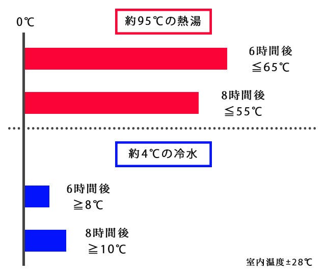 保温力:室温約28度の部屋に置き、95度の飲み物を入れた時、6時間後は65度以上、8時間後は55度以上に保温されます。