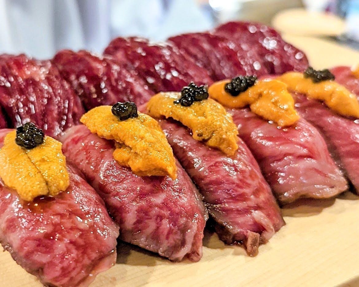 「焼肉かきだ」では国産の和牛にこだわったコースをご用意。「有楽町かきだ」と同じく、コース終了後は、お好きな部位をおかわりすることができます。もちろんお酒も飲み放題。そして、「焼肉かきだ」だからこそできる楽しみ方が、お寿司も同時に食べられるということ。