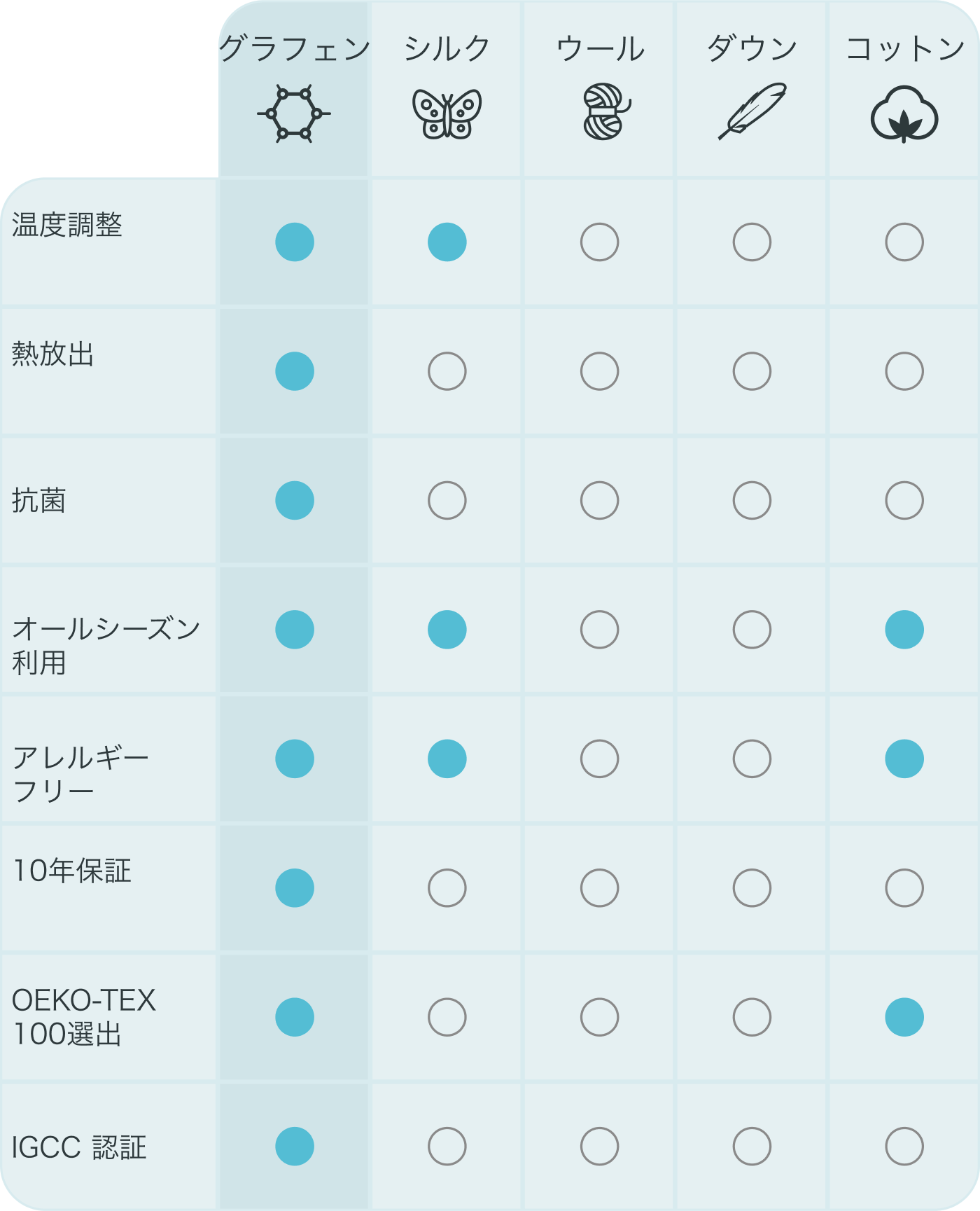 ノーベル賞を受賞した新素材グラフェン100%の素材を含んでできており、ブランケットの概念を超える脅威の熱伝導性と湿気を分散させることが可能。