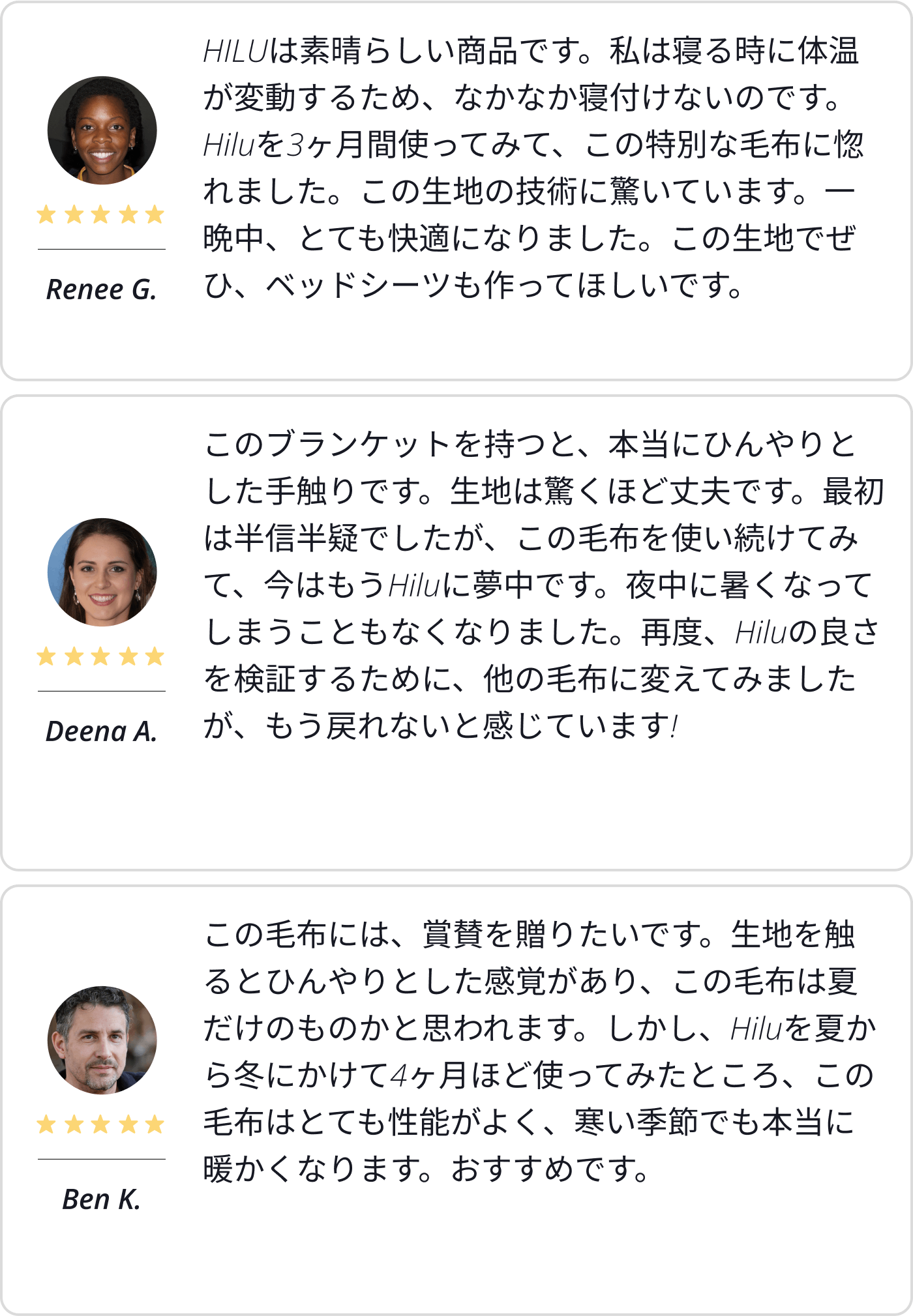 一晩中寝返りを打つような眠りの浅い人も、夜中にほてりを感じる人も、HILUブランケットはあなた快適なベッドタイムをサポートします。