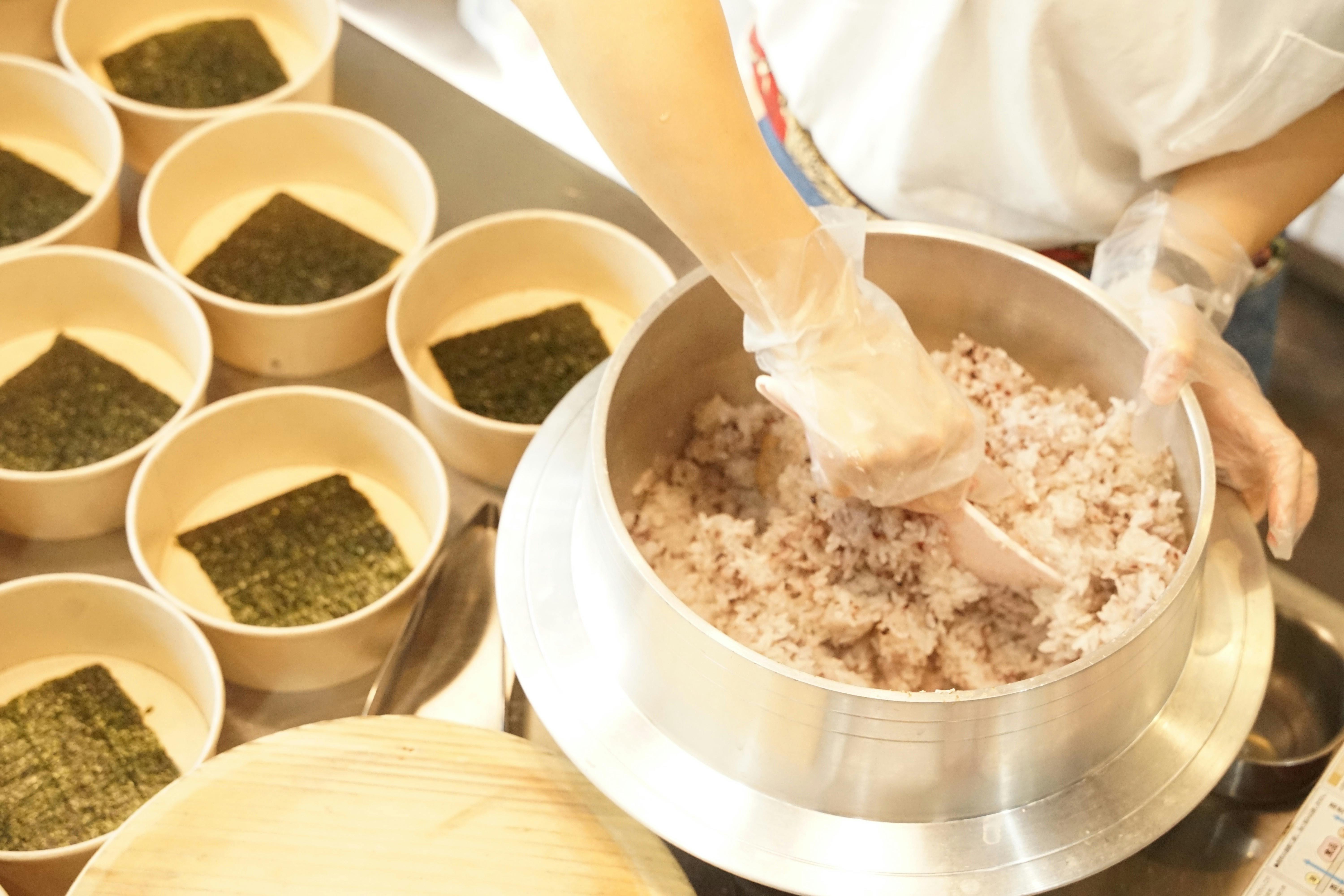 さらに冷めても食味が落ちにくくお弁当おむすびには最適なお米なんです。玄米を忍ばせる事で独特のプチプチした食感を楽しめたり、府中産の特産物である黒米も使用しもっちりとした食感だったり味も見た目も飽きの来ない工夫で喜んでいただきたく思っております。