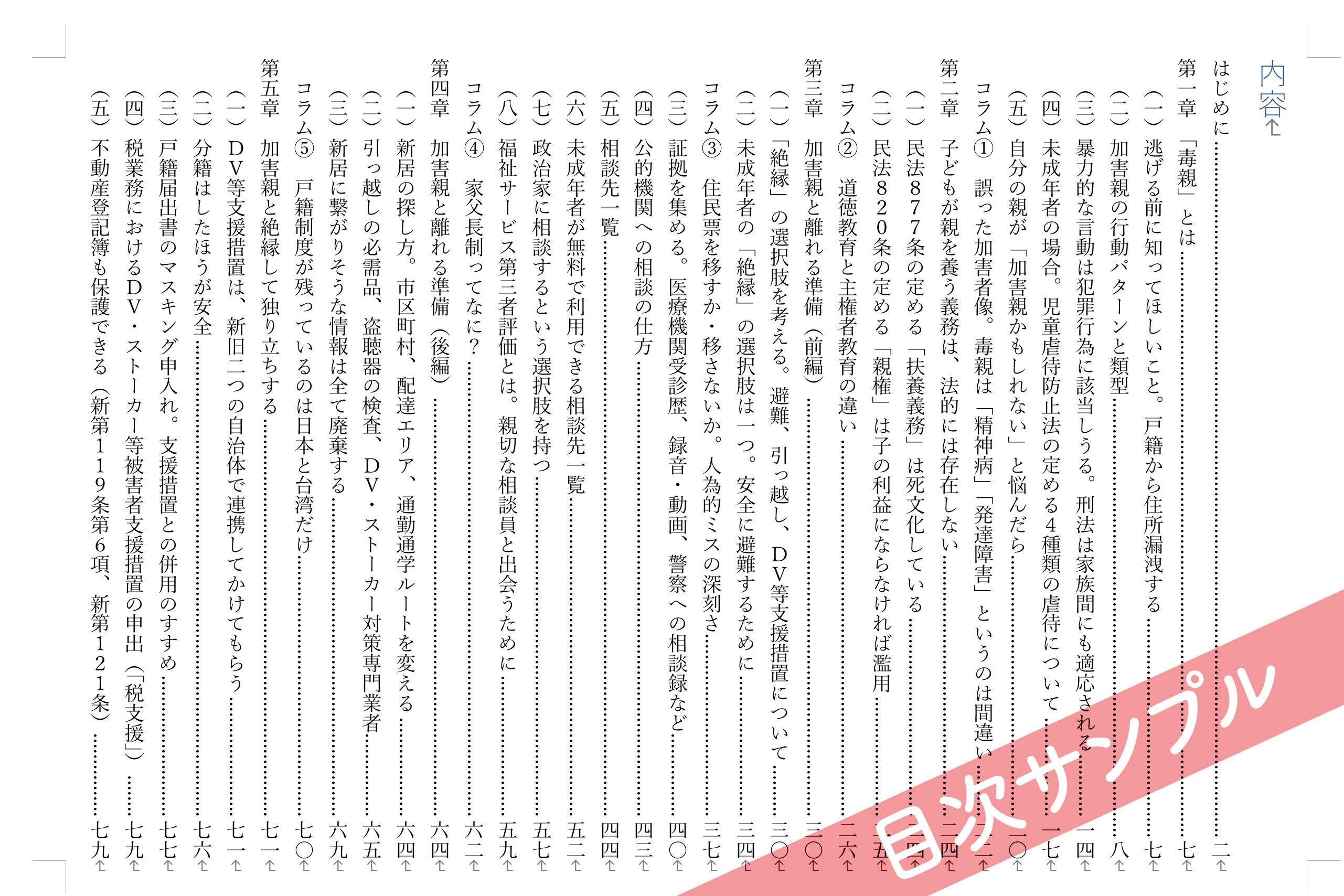 まず「目次」と「はじめに」に勇気づけられました。「目次」の章立てそのものが毒親=加害親から逃げる段階になっているとともに、「私」の体験が余すことなく「はじめに」へ反映されていると、感じたからです。本当に「毒親」の怖さを知らない人による「親孝行」の押し付けは被害者にとっては無自覚なるニ次加害と言わざるを得ません。加害者の報復にも対策が行き届いていることにも感心しました。なお、「子ども」の表記については、思い切って「子」に縮めても十分ではないかとも思いますが、私の知らない意図があるのかもしれませんね。