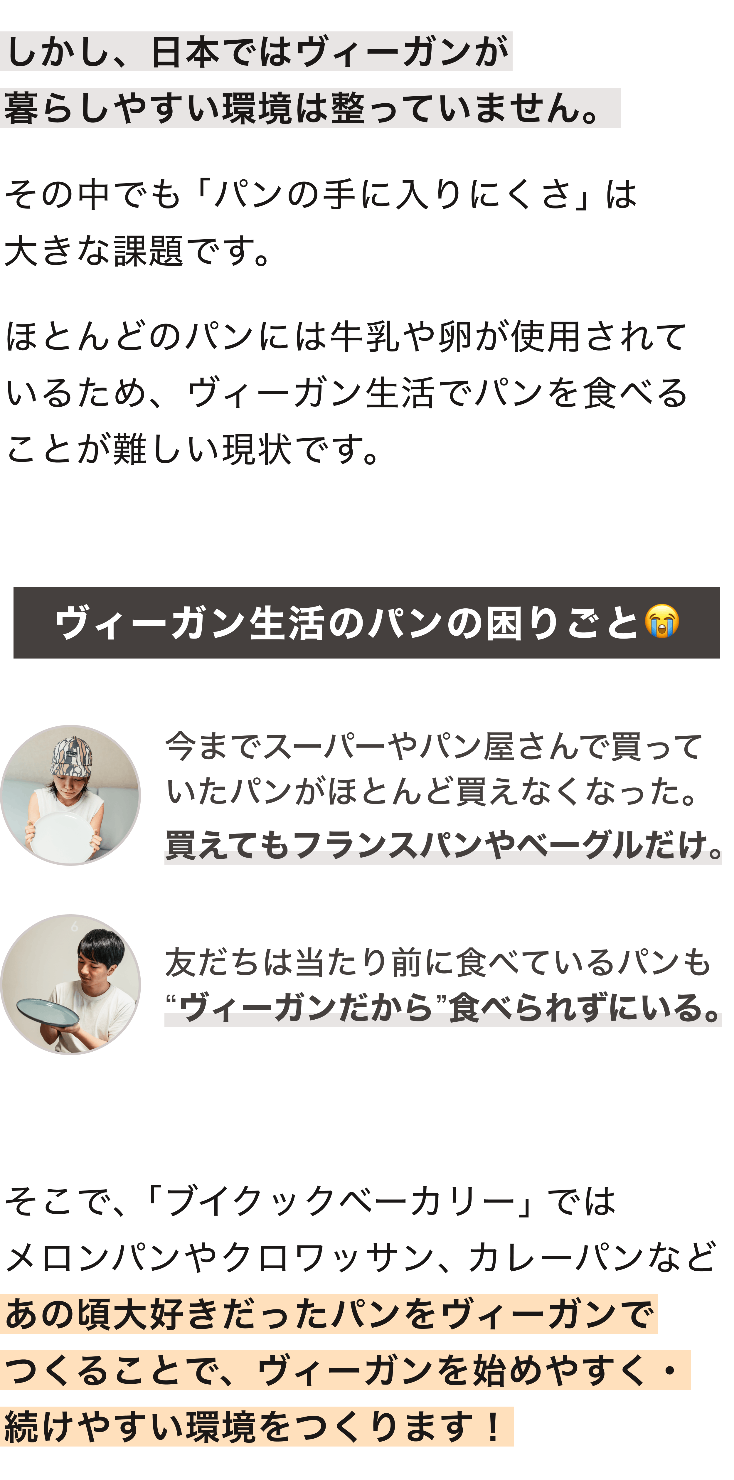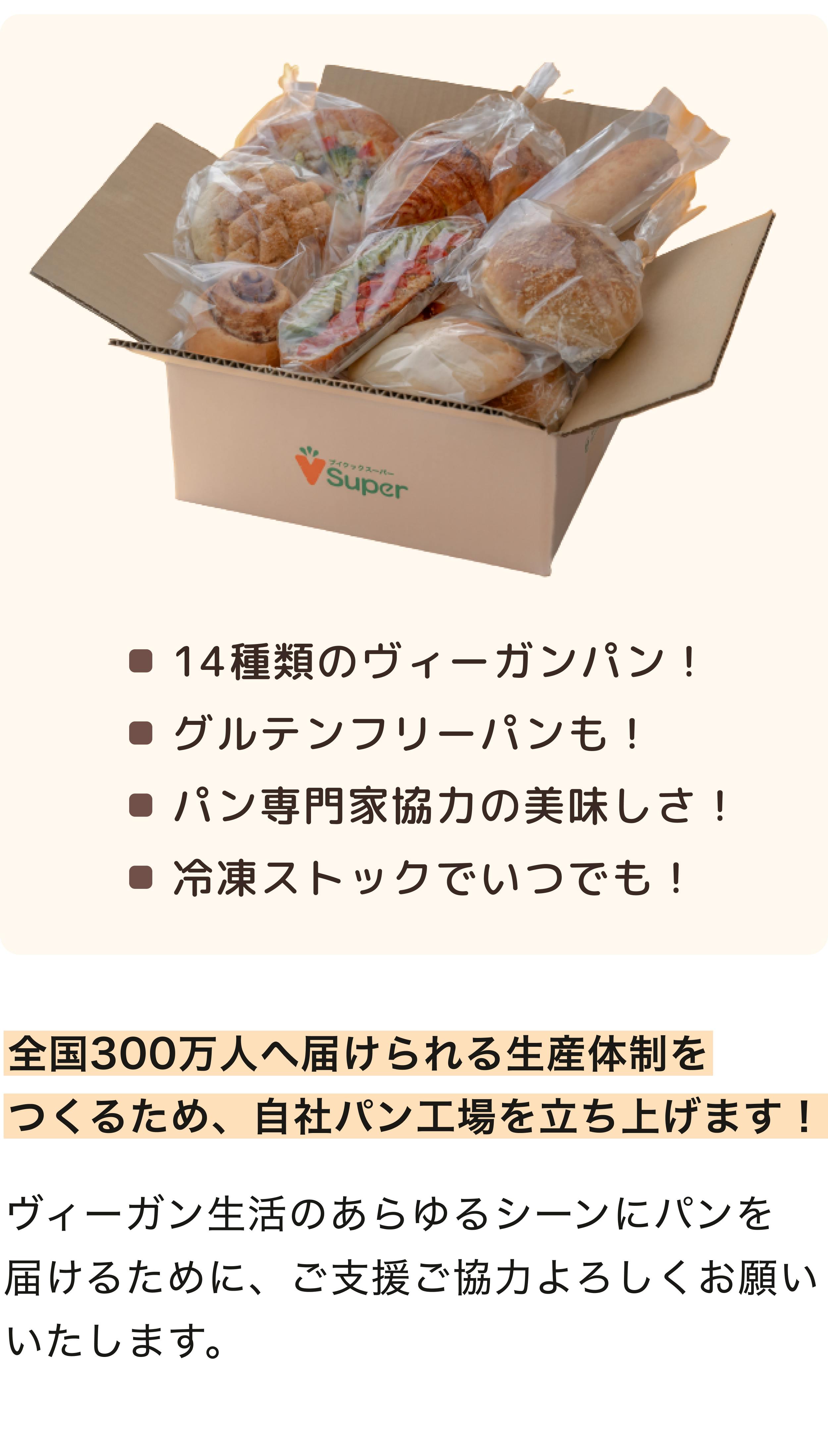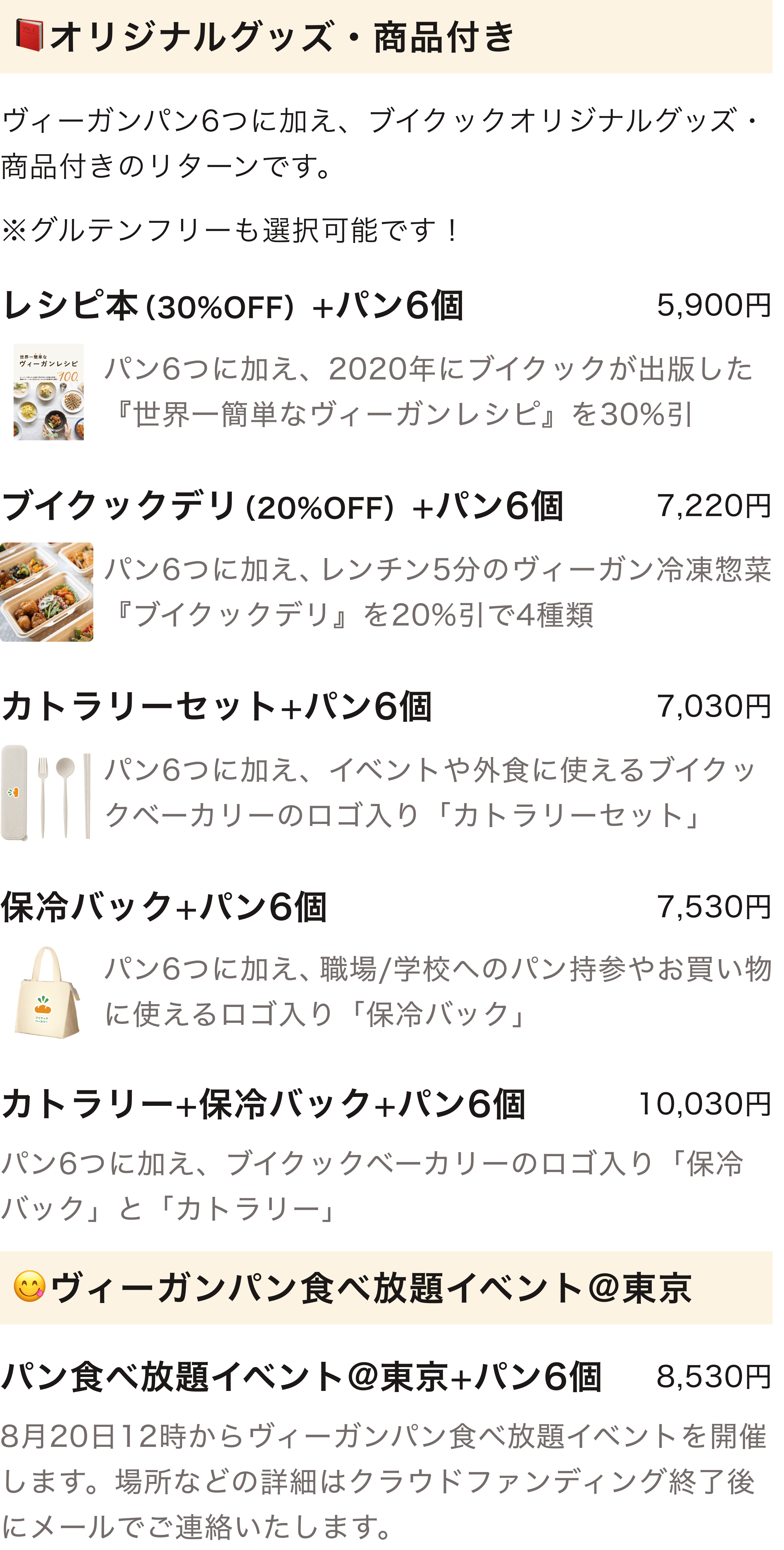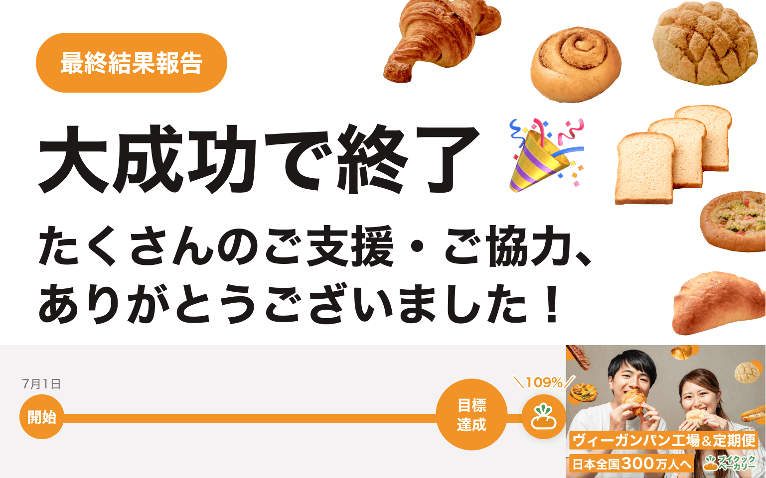 2023/07/22 22:59夜遅くに申し訳ありません。ブイクックの工藤柊です!応援してくださる皆様にお伝えすなければと、活動報告を緊急で書いています。なんと、100%達成しました...!!!ご支援いただいた皆様、SNSシェアいただいた皆様に、改めて感謝です。ひとまず、一安心しています。ヴィーガンパンを日常にするために、こんなにも多くの方に共感・支援いただけて、本当にありがたいです。明日23:59までに、300人を目指して。そして、今回のクラウドファンディングの本来の目標である、「ヴィーガンパンを300人に届けること」を目指して、明日の23:59まで頑張り続けます!のこり15人に支援いただけるよう発信など頑張り続けていきます。最後まで、ご協力よろしくお願いします!(明日は、ビーガングルメ祭りにも出店していますので、もし見かけることがあればお声がけいただけると嬉しいです。) もっと見る