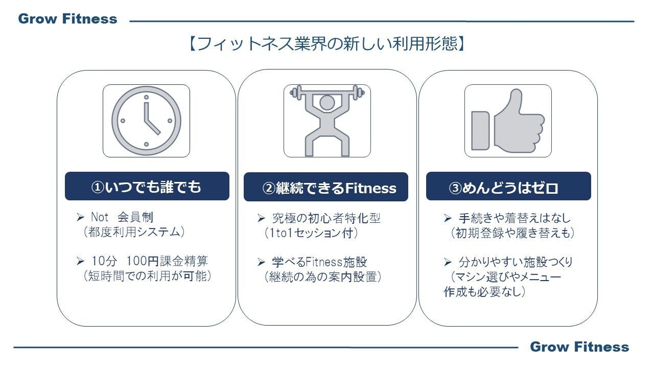また、日本のFitnessを育てる、Fitnessで育つ事を目指しGrow Fitと名付けました。