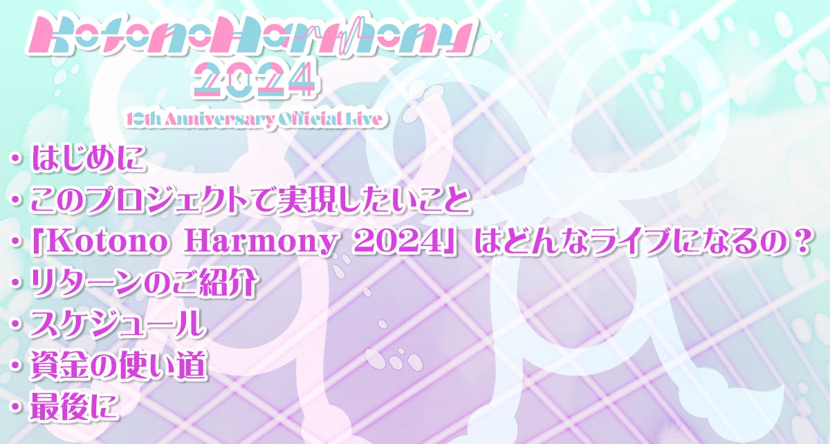 このプロジェクトでは、琴葉姉妹10周年記念公式初ライブ「Kotono Harmony 2024」の開催です。