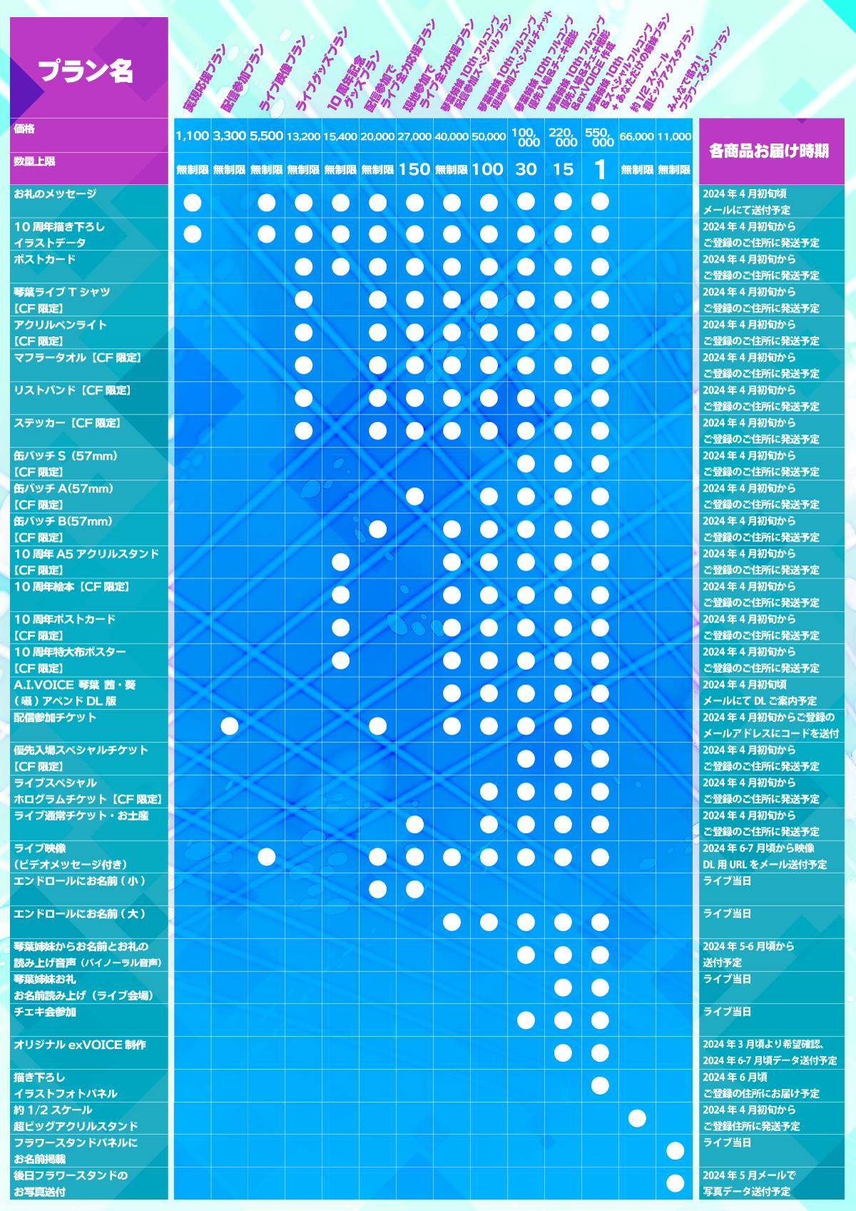 各プランのリターンの内容と、お届け予定日の一覧表です