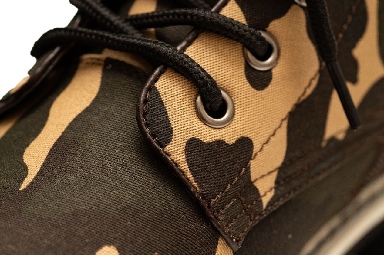 こちらは堀江貴文がかつて愛用していた幻のフットウェアブランドのデザインをイメージして、復刻させたものになります。"履く人の個性を際立たせる"の理念に恥じない、おしゃれな迷彩柄を採用しました。