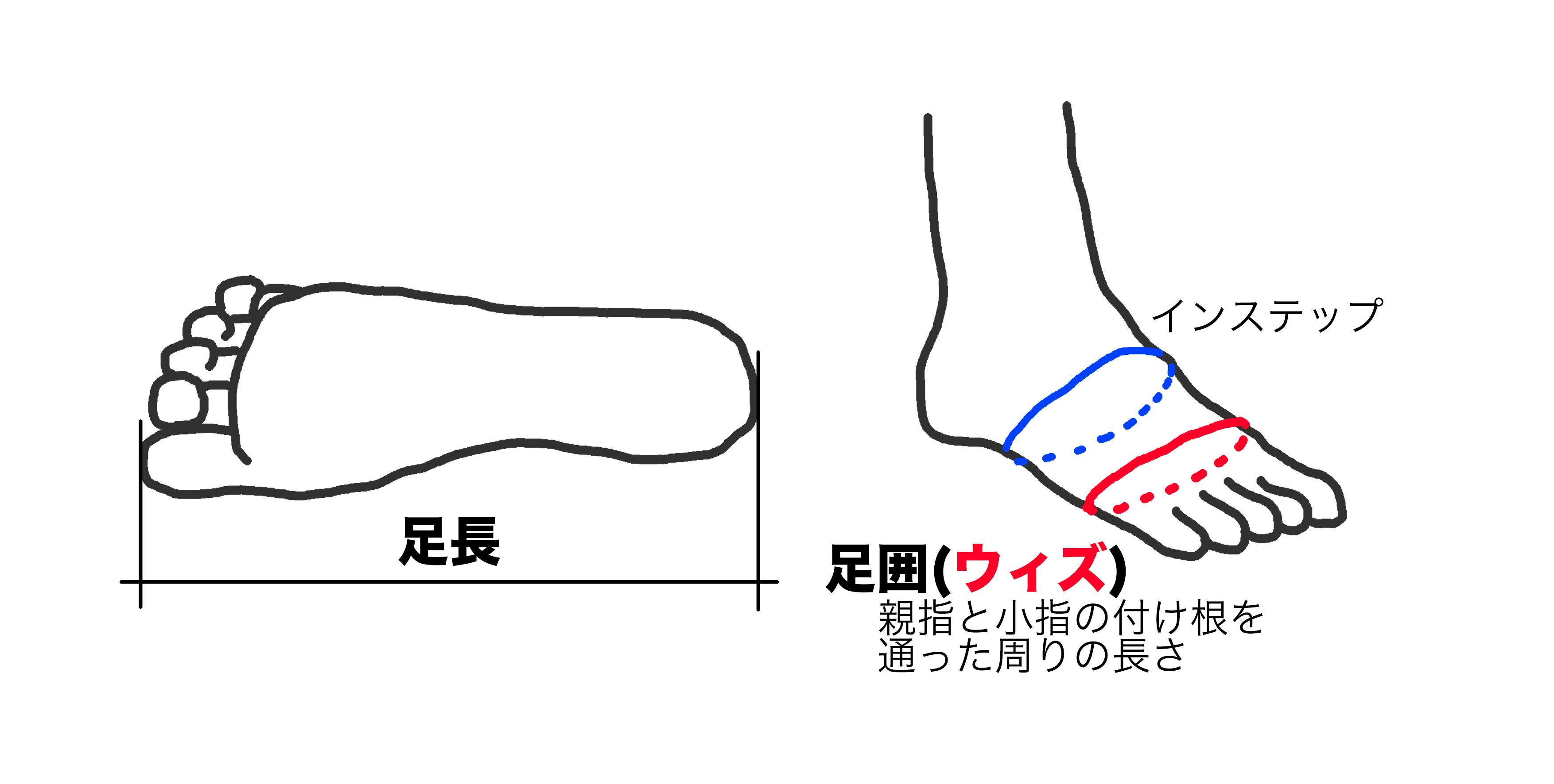 紐の縛りやインソールで足の甲高(インステップ部分)は調整できるため、足囲(ウィズ)の方が重要です。足囲が26cmを超える方は、Lサイズを推奨します。