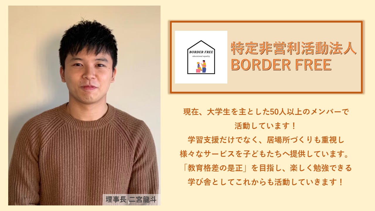 この度は、BORDER FREEのクラウドファンディングに興味をお持ちいただき誠にありがとうございます。二宮とともに理事長を務めております、石井陽斗(早稲田大学3年)と申します。