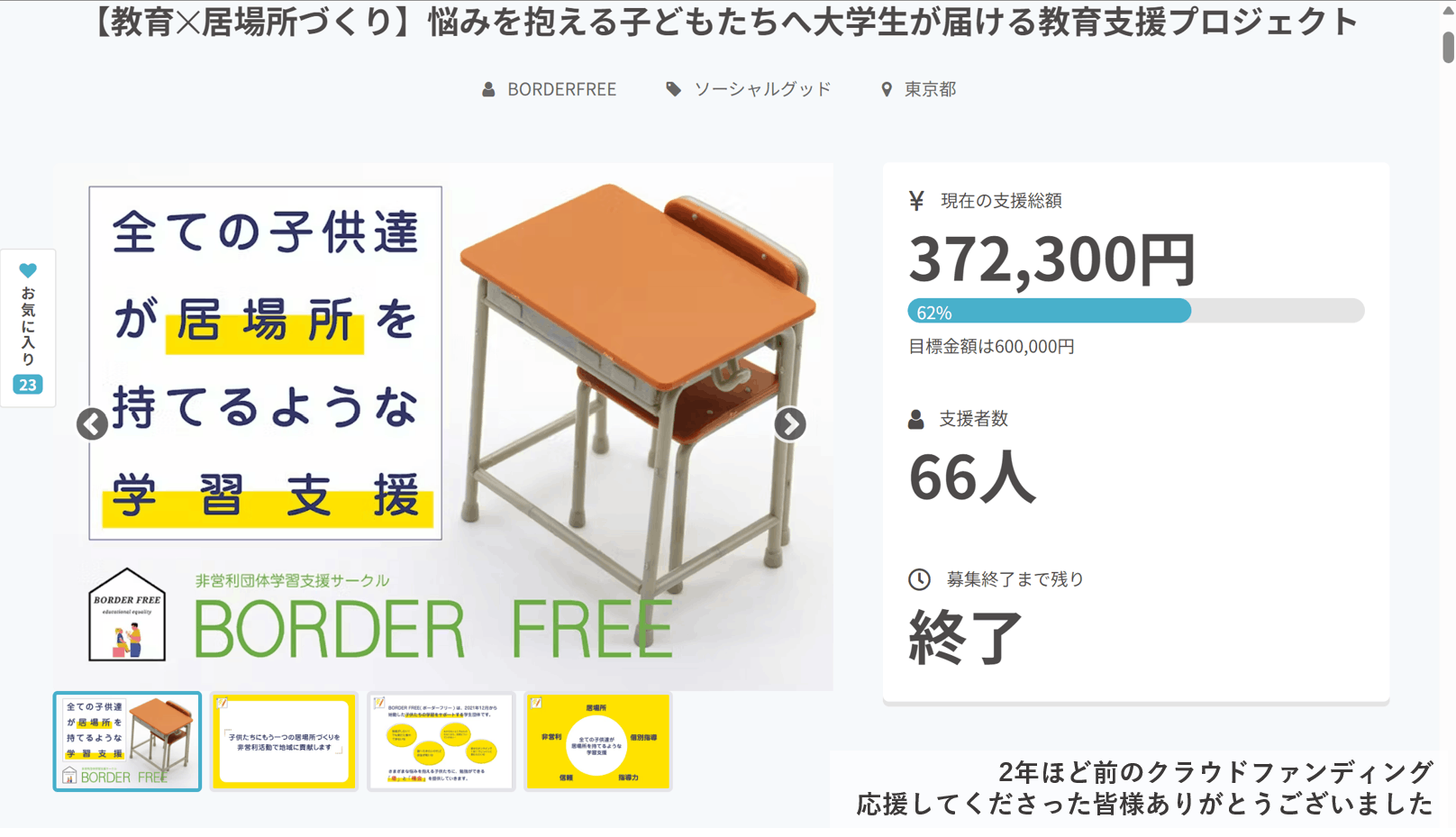 話は少し変わって、2年ほど前にこちらのサイトでクラウドファンディングを実施し、37万円をご支援いただきました。応援をしてくださった皆様本当にありがとうございました。この場をお借りして御礼申し上げます。皆様からの支援金を活用して、今日まで事業を存続させ成長させることができました。