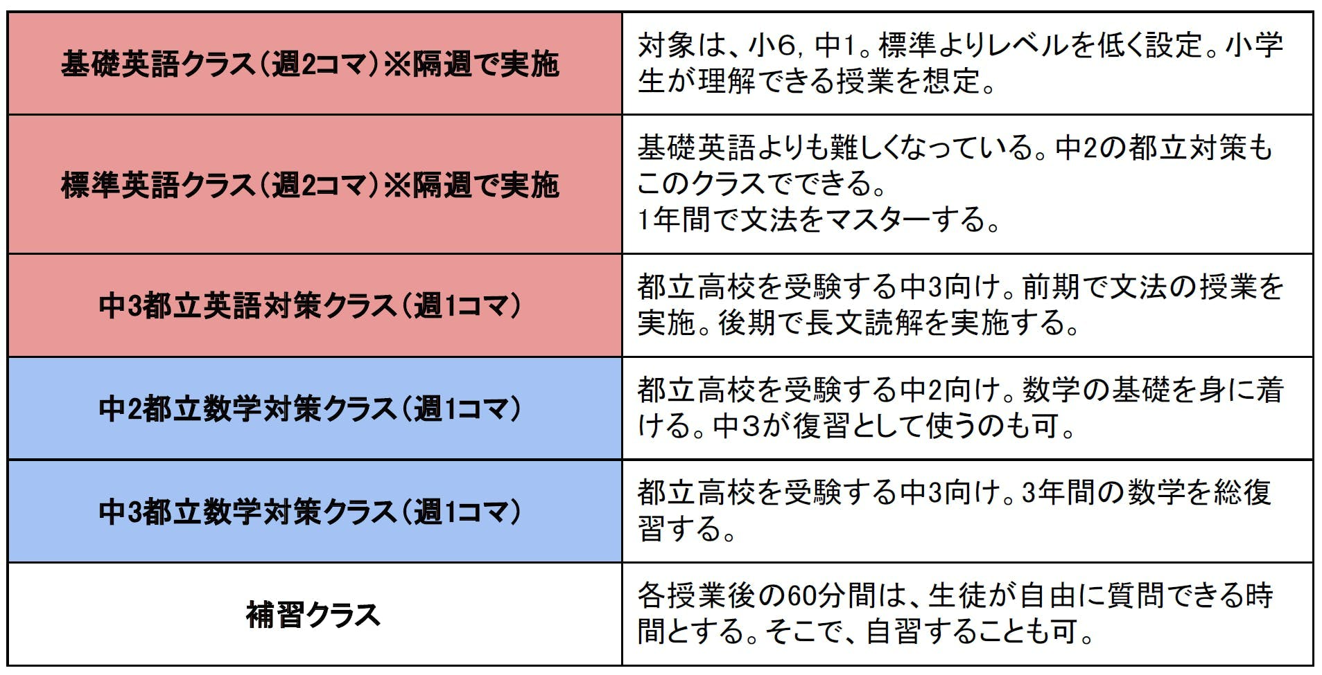 ・中3都立英語対策クラス:毎週水曜日 17:00〜19:00(18:00〜19:00は補習クラス)