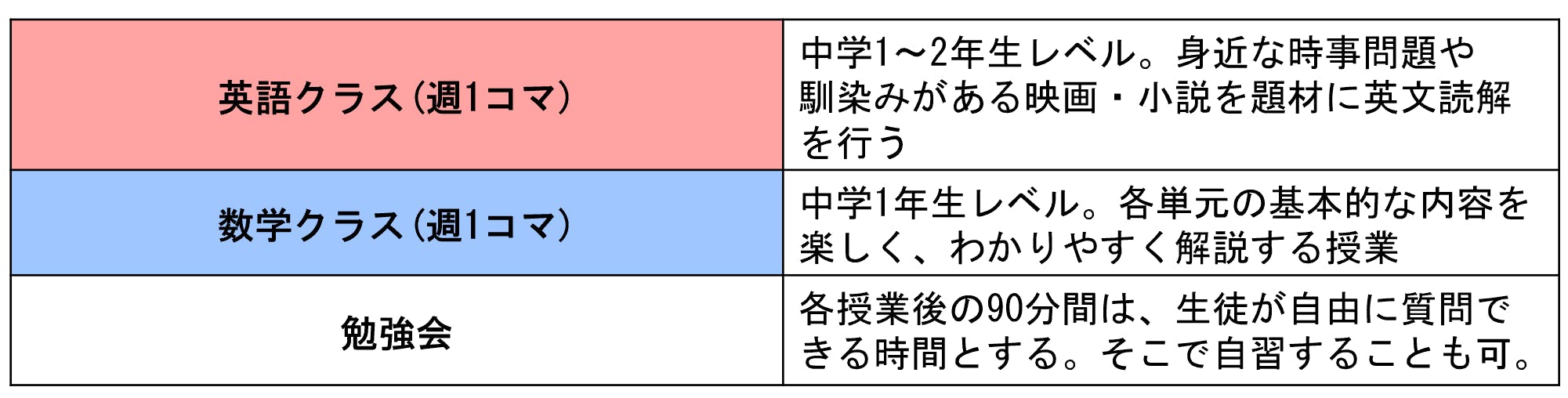 開校日時:毎週火曜日18:00~20:30(数学)、毎週金曜日18:00~20:30(英語)