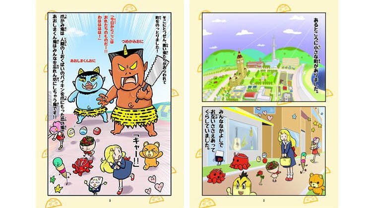 今回の絵本に登場する鬼は「チャムーくん(8歳)」の描いた「つめかみおに」と「なるはちゃん(9歳)」の描いた「あおしまくんおに」。それをプロのイラストレーターの「まいてぃ」さんが絵本にしてくださいました。画像は冒頭の2ページです。
