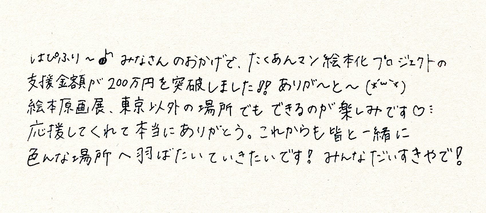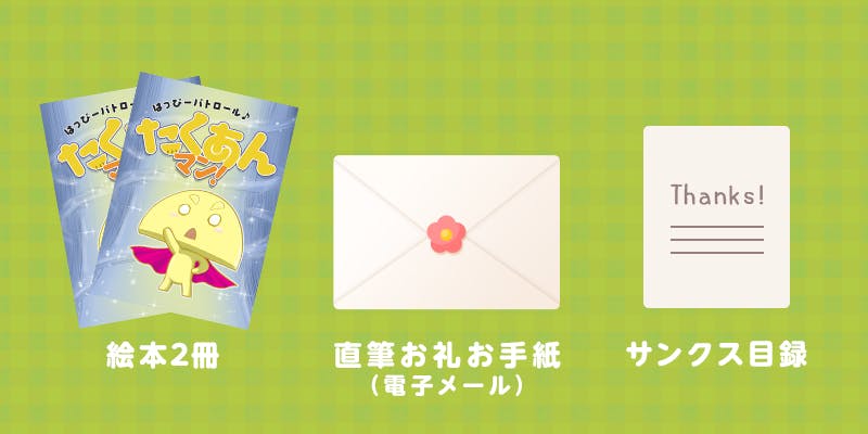 この絵本を全国の幼稚園、保育園、小学校、図書館にできるかぎり無料でお届けし、たくさんのお子さんに「たくあんマン」を知ってもらって作品を創る楽しさを広げていくことを夢見ています。