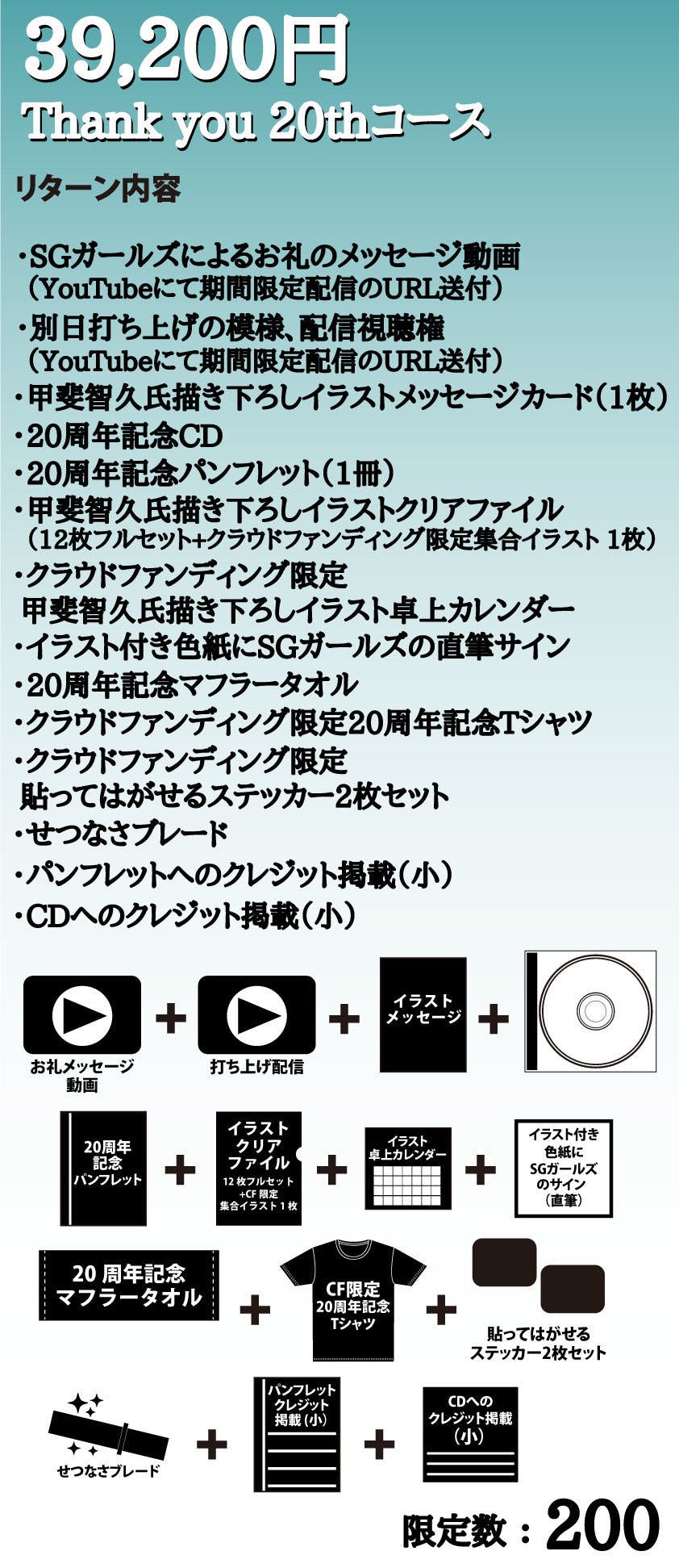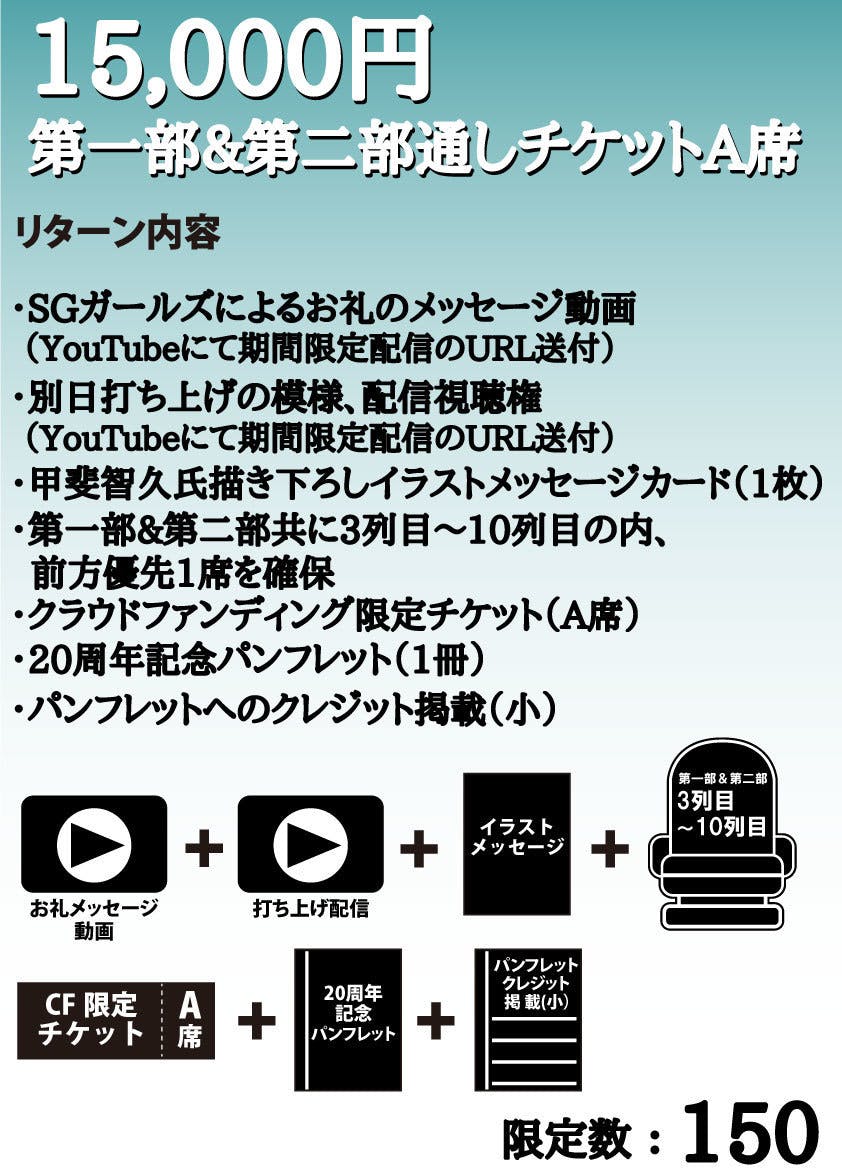 2,500万円:新曲制作、記録映像(編集済み)DVDを支援者さま全員にプレゼント、新規オリジナル衣装制作、パンフレットのページ数アップに加えて、大倉らいた氏シナリオによるオーディオドラマ制作(20周年記念CDに収録)