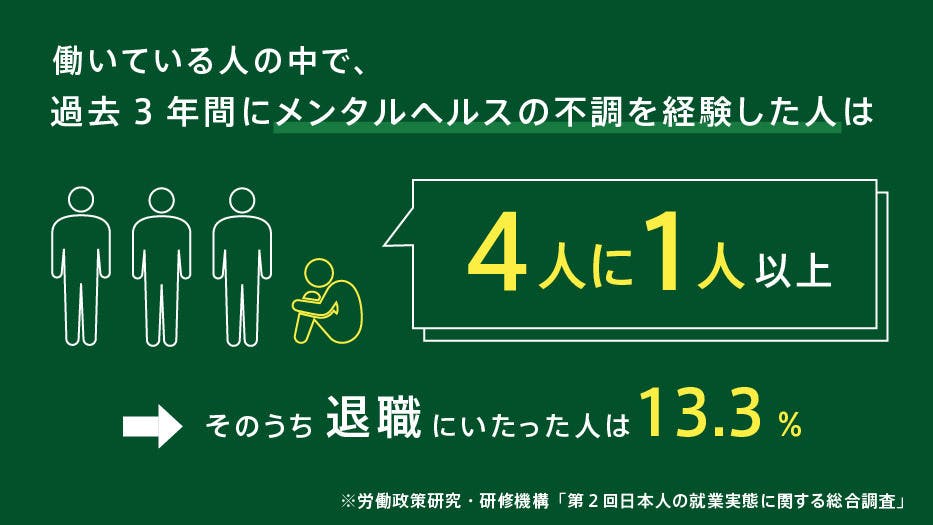 近年うつ病の患者数がおよそ100万人の規模にまで増加するなか、2014年に実施されたある調査(※)によれば、働いている人の中で過去3年間にメンタルヘルスの不調を経験した人は4人に1人以上(25%以上)と言われています。また、メンタルヘルスの不調から退職にいたった人はそのうちの13.3%にのぼるという結果も出ています。