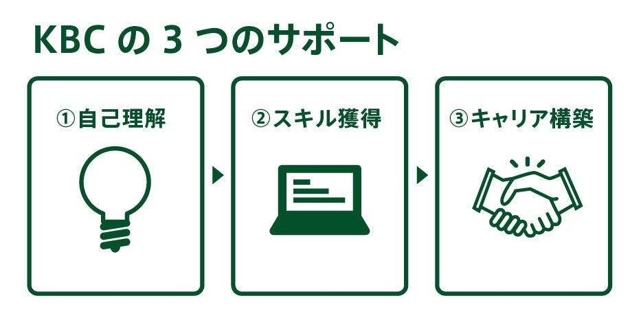 だからこそ、KBCの本質は以下3つのサポートに凝縮されます。つまり、①自己を理解し、②自分が学ぶべきスキルを選択し、③自分と相性の良い働き方や職場を見つけ出す、ということです。
