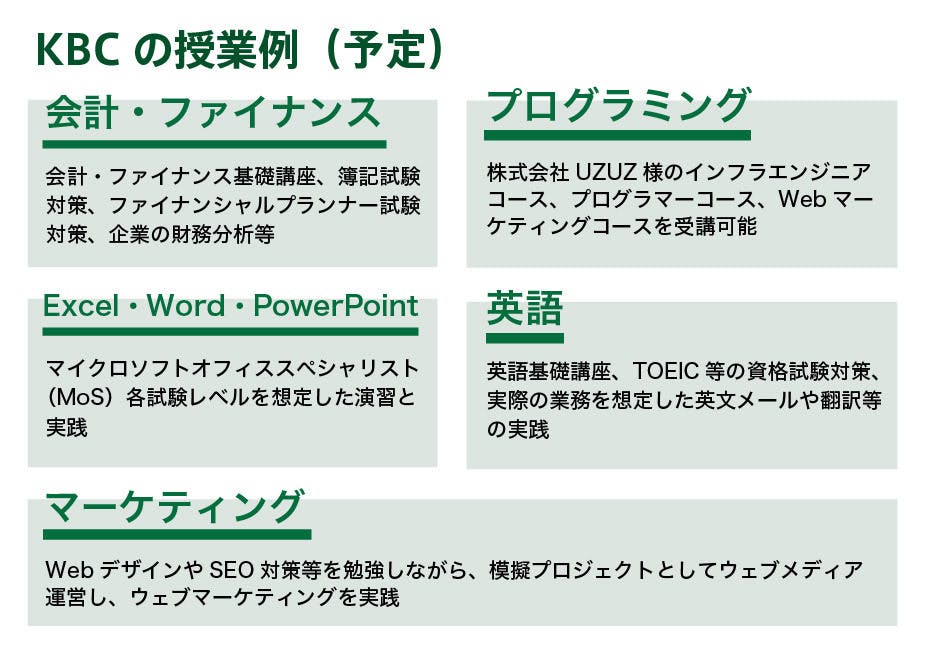 KBCの授業で大事にしたいことは「多様性」と「専門性」です。何を学ぶかを狭く決めきって時間割を組むのではなく、プロフェッショナルな講師陣による様々な従業を受ける中で、自分に合ったスキルは何なのか、これから特に集中して伸ばして行くべき能力は何なのかを見極めていただけたらと思っています。