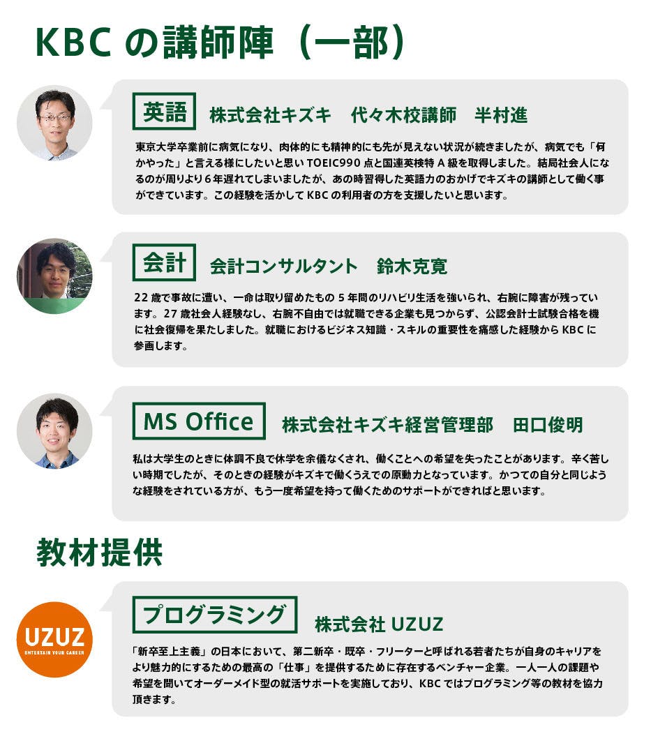 そうした考え方に立って、KBCではそれぞれに合った働き先・働き方を見つけるサポートをするだけでなく、入社後についても、継続的面談や、任意研修(専門スキル、時間管理や忘れ物対策等「ライフハック」となるノウハウ、他)の提供を通じて、利用者の方の定着支援をより効果的に行っていきます。