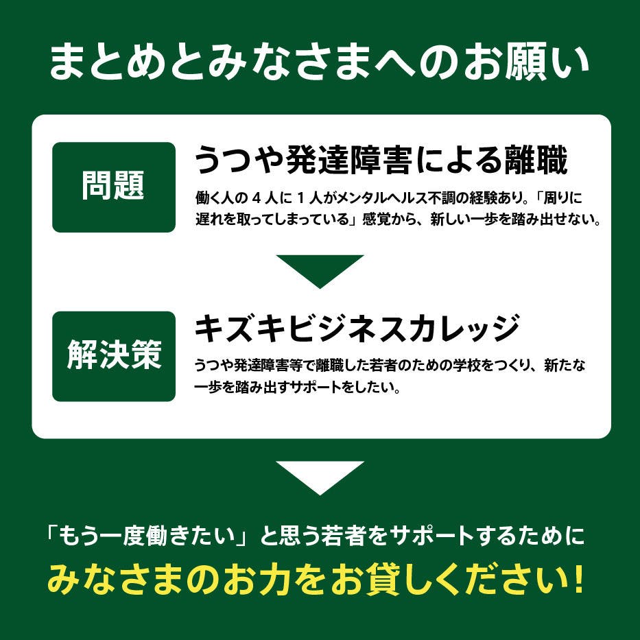 来年、私は新しいチャレンジを始めたいと思います。それは、うつや発達障害が理由で、務めた会社を休んだり辞めたりせざるを得なくなった若者たちのための「ビジネスカレッジ」をつくるという挑戦です。